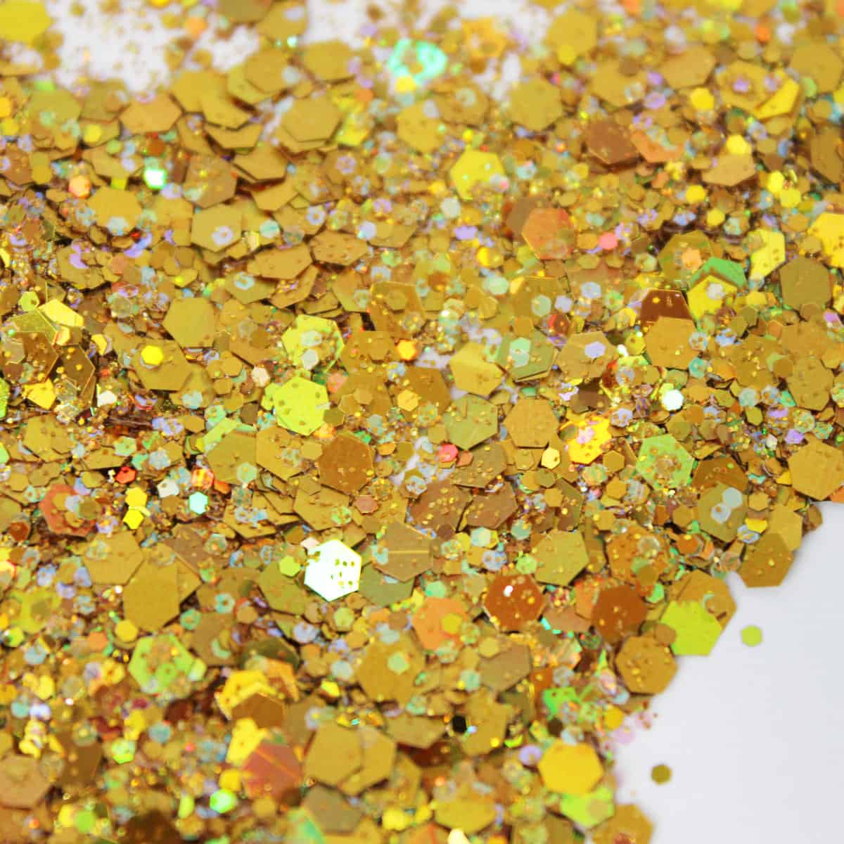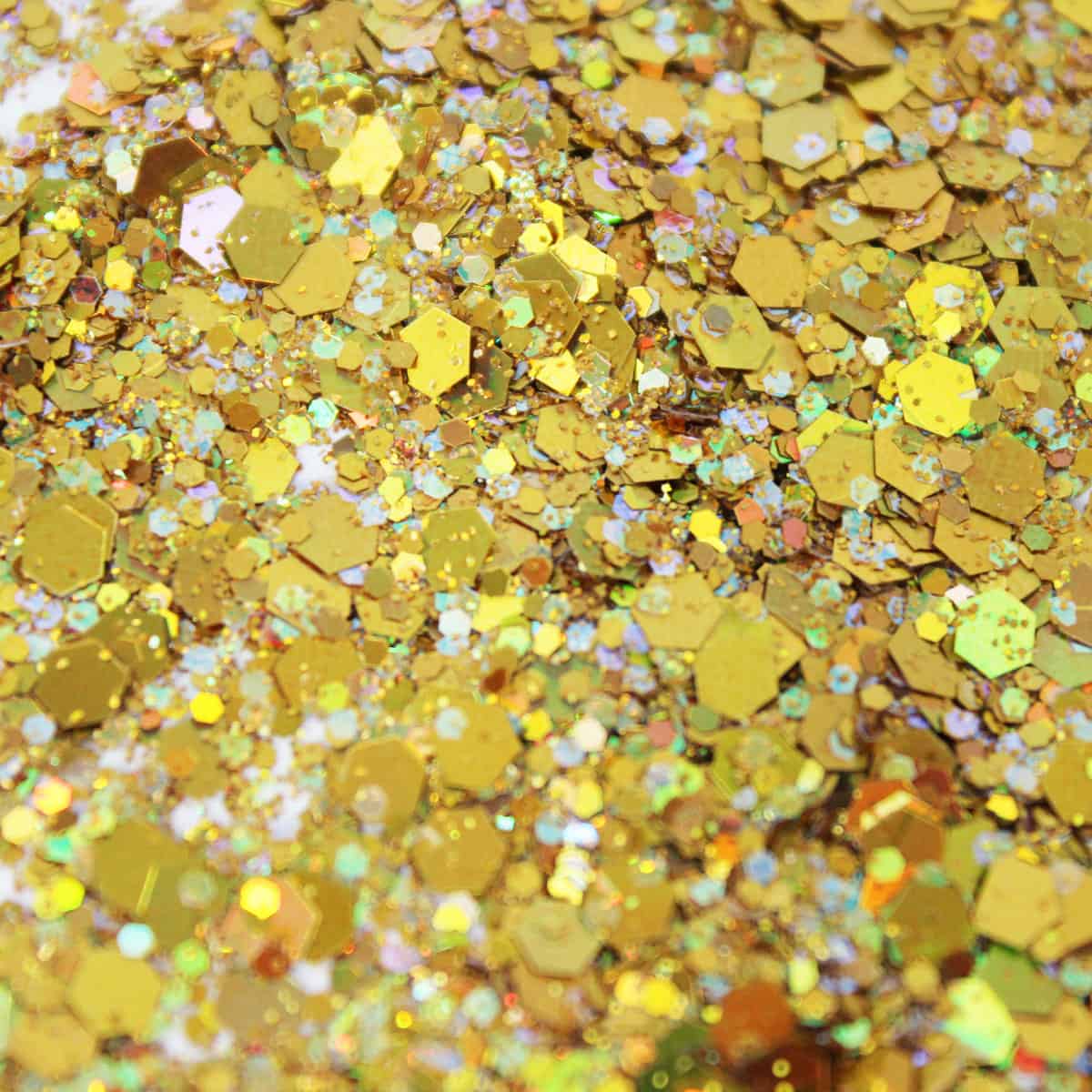 Beehive is a color-packed metallic reflective glitter with large reflective hexagonal shapes, medium reflective hexagonal pieces, and fine multicolored reflective glitters. Its rich yellow-gold overtones gives Beehive its name. Compacted this glitter appears a yellow gold. Hues that are easily seen are bright reds, greens, blues, and yellows – this all depending on the intensity and location of the light source. This glitter appears more yellow over dark backgrounds and multi-colored over light/white backgrounds. Darker backgrounds seem to bring out the red and green reflected hues.