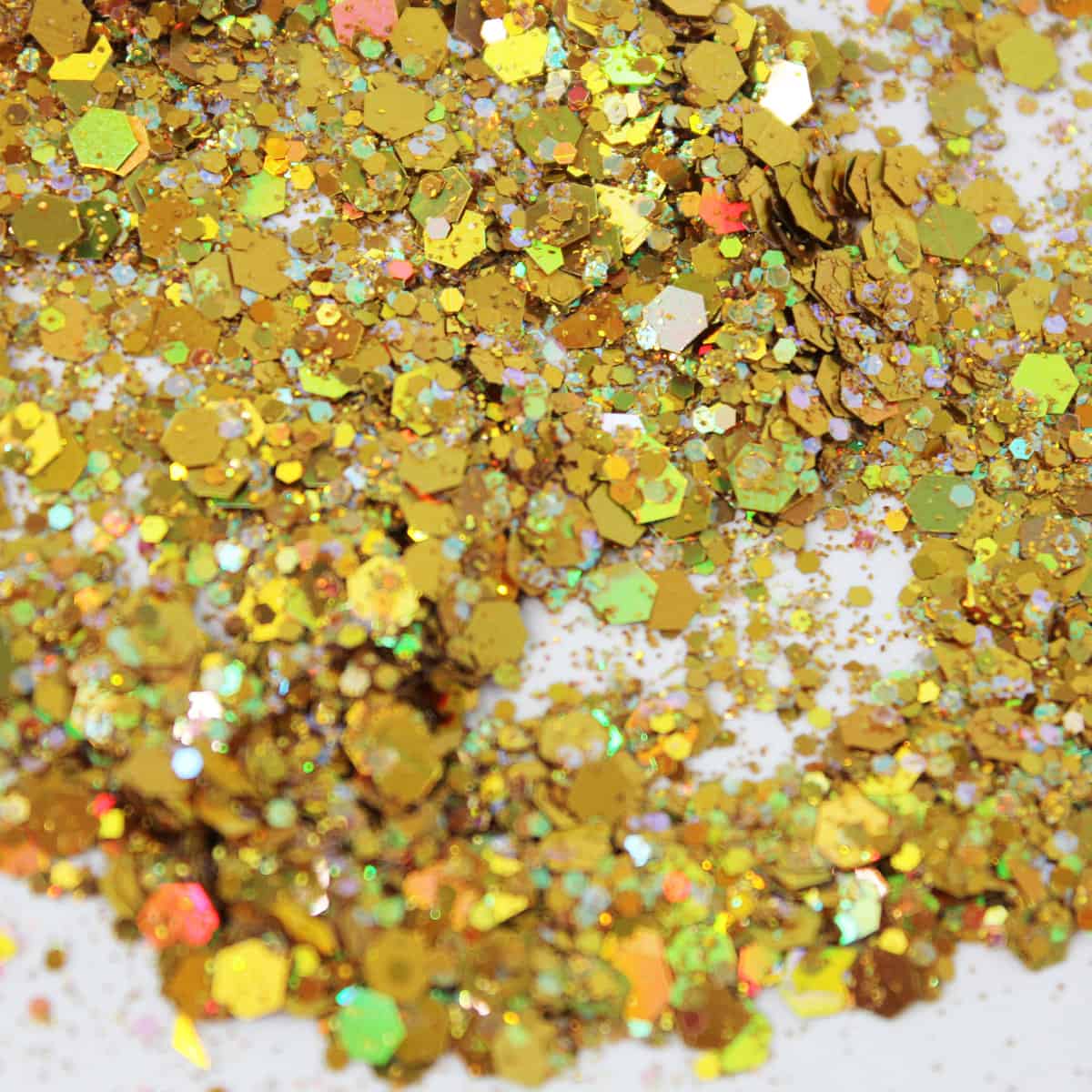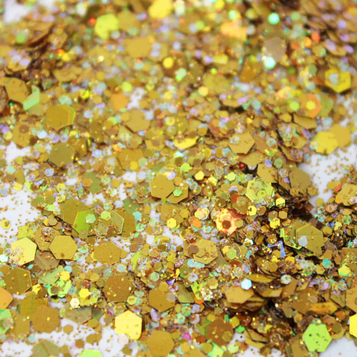 Beehive is a color-packed metallic reflective glitter with large reflective hexagonal shapes, medium reflective hexagonal pieces, and fine multicolored reflective glitters. Its rich yellow-gold overtones gives Beehive its name. Compacted this glitter appears a yellow gold. Hues that are easily seen are bright reds, greens, blues, and yellows – this all depending on the intensity and location of the light source. This glitter appears more yellow over dark backgrounds and multi-colored over light/white backgrounds. Darker backgrounds seem to bring out the red and green reflected hues.