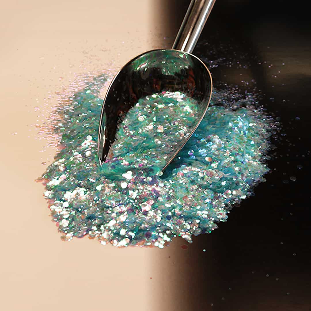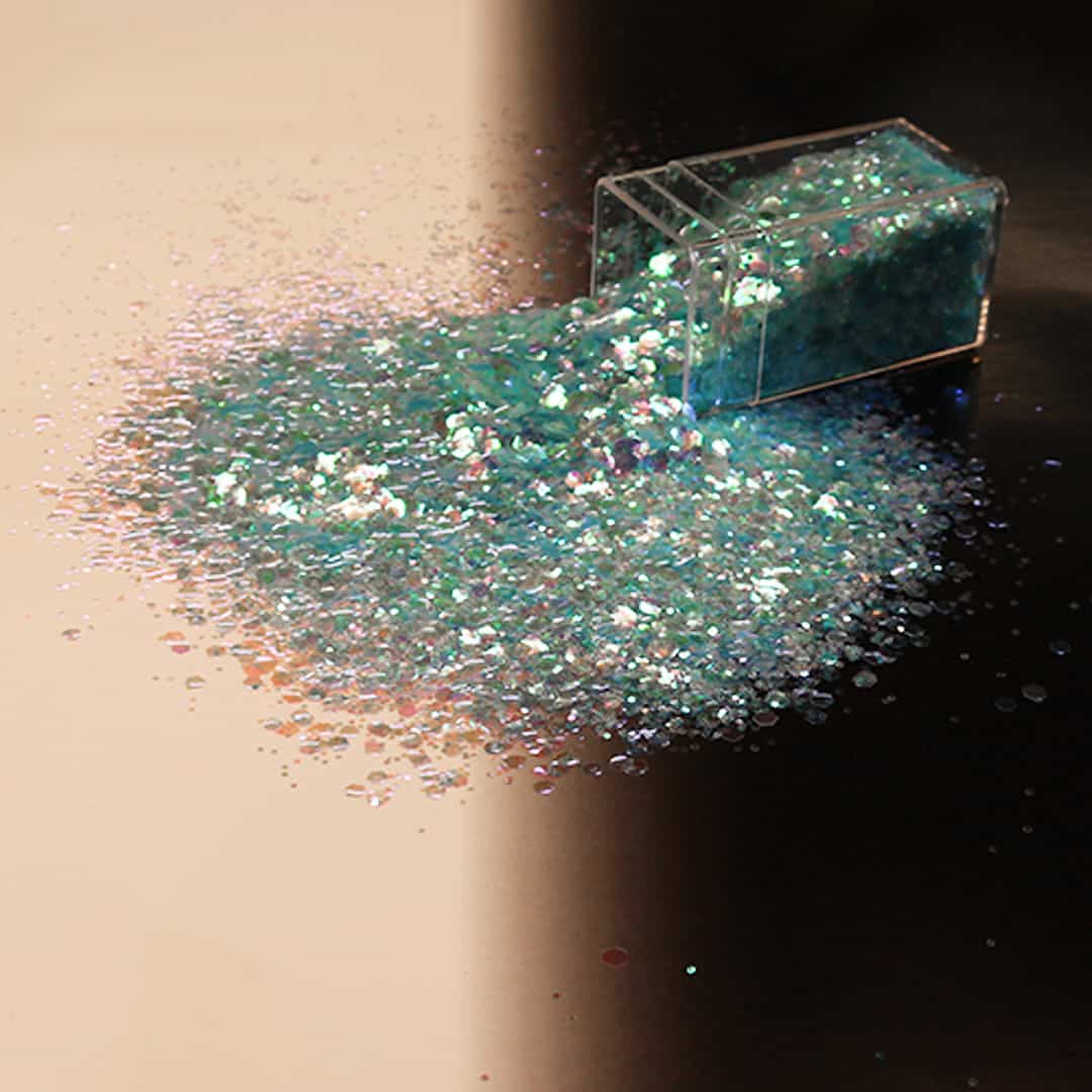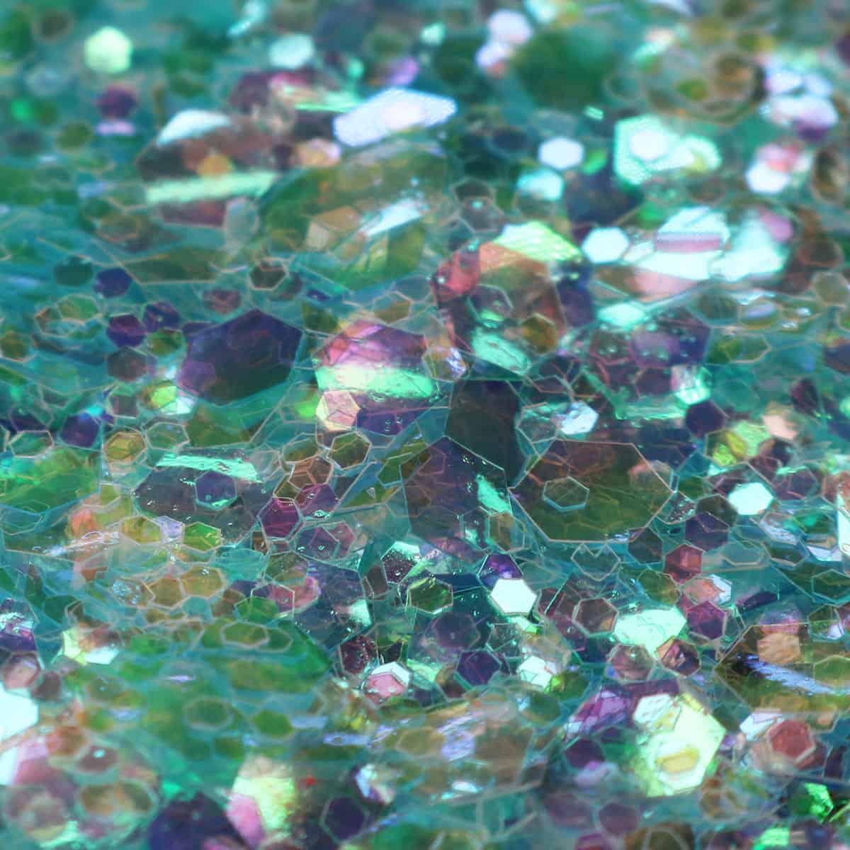 Blue Oasis consists of two different sizes of glitter flakes. One is a chunky hexagonal flake that when clustered together exhibits a light rich cold blue hue with reflective properties. The smaller hexagonal flakes have the same color and reflective properties as the larger flakes and add variety and dimension to the glitter. Soft pastel colors are reflected under low light while bright blues, pinks, and gold are reflected under direct light. In large quantities this glitter doesn’t change properties over different colored backgrounds. However, if it is sparsely applied it appears pink, orange, and purple (pastel-like) over white, and light blue and purple (pastel-like) over a dark background.