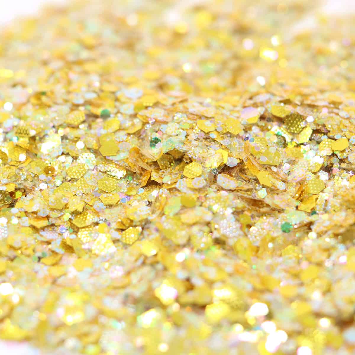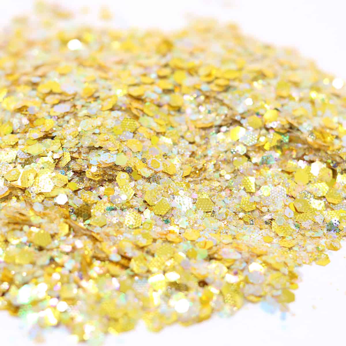 Dandelion is a yellow & iridescent reflective glitter with medium reflective hexagonal pieces, and fine reflective glitters.Hues that are easily seen are yellows,greens and pinks.