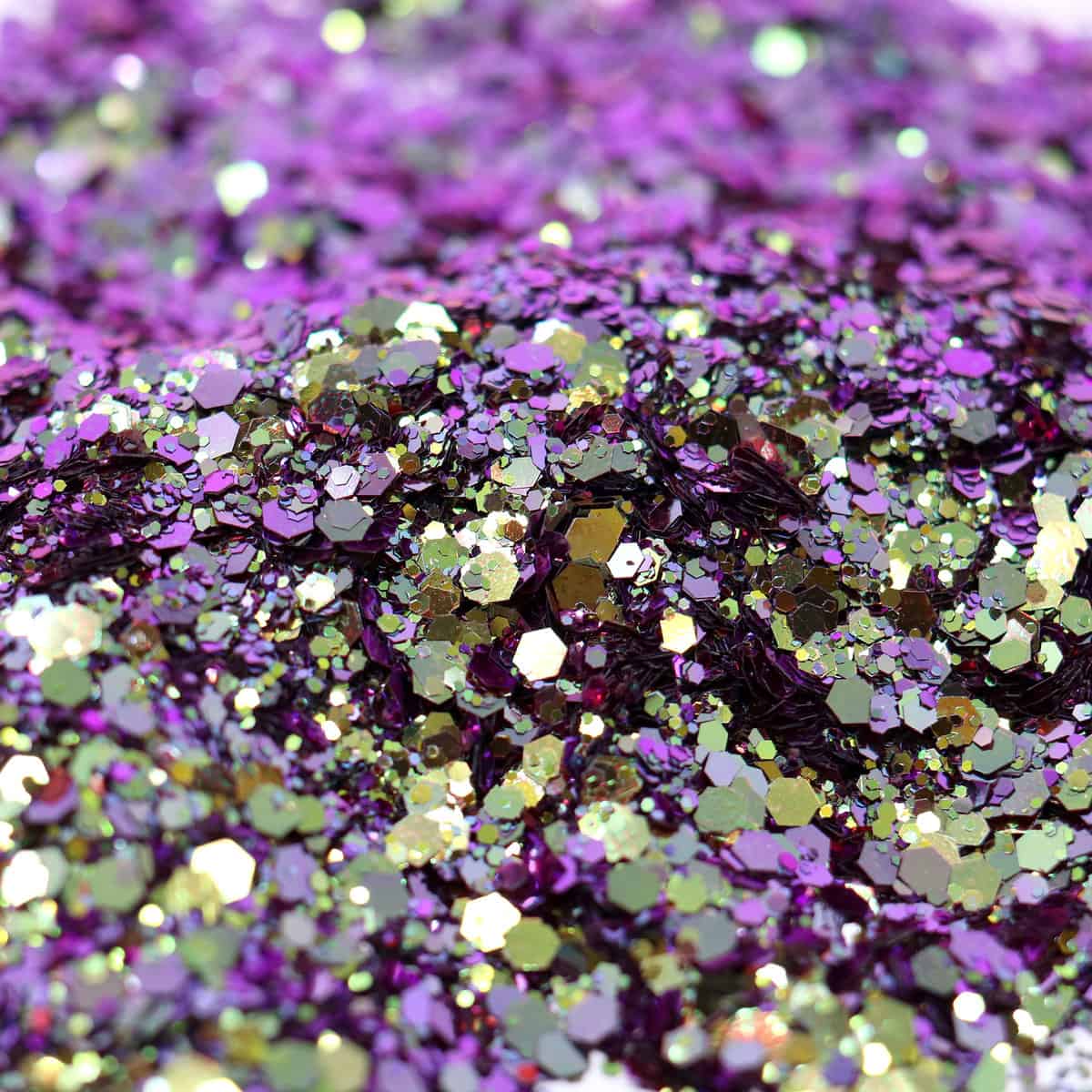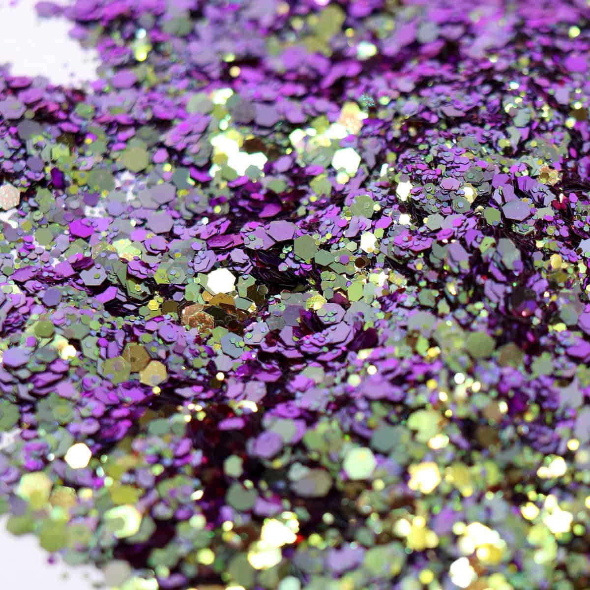Hot Mess is a combination of a gold and multiple purple hue glitter. It has a lot of dimension from the varying flake sizes from fine, to medium, to large. The metallic flakes are hexagonal-shaped.