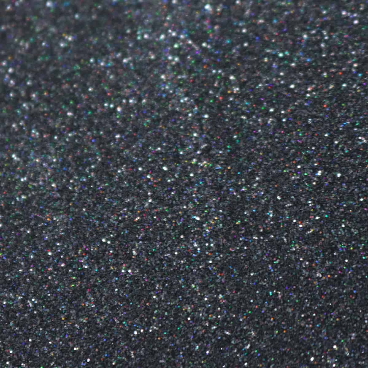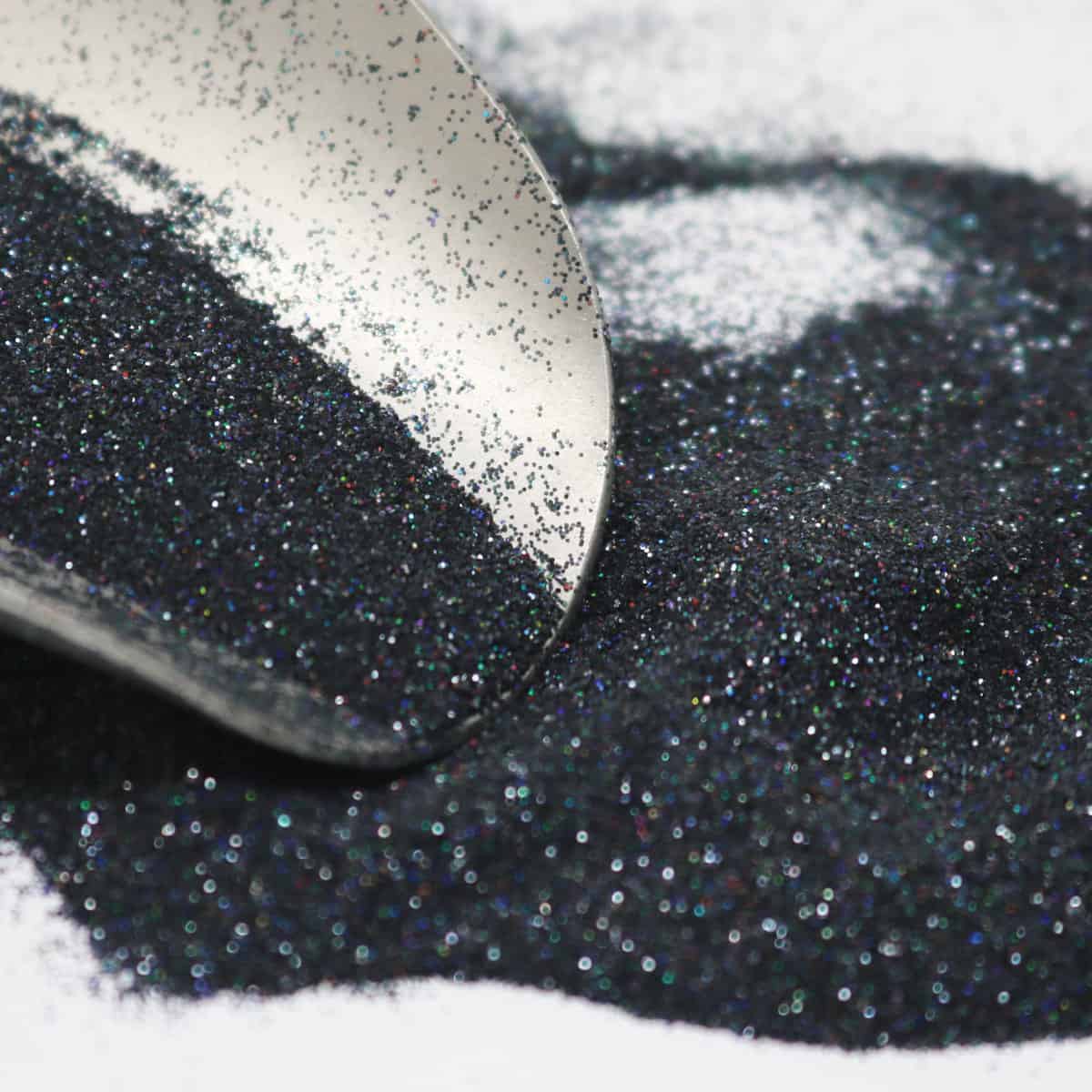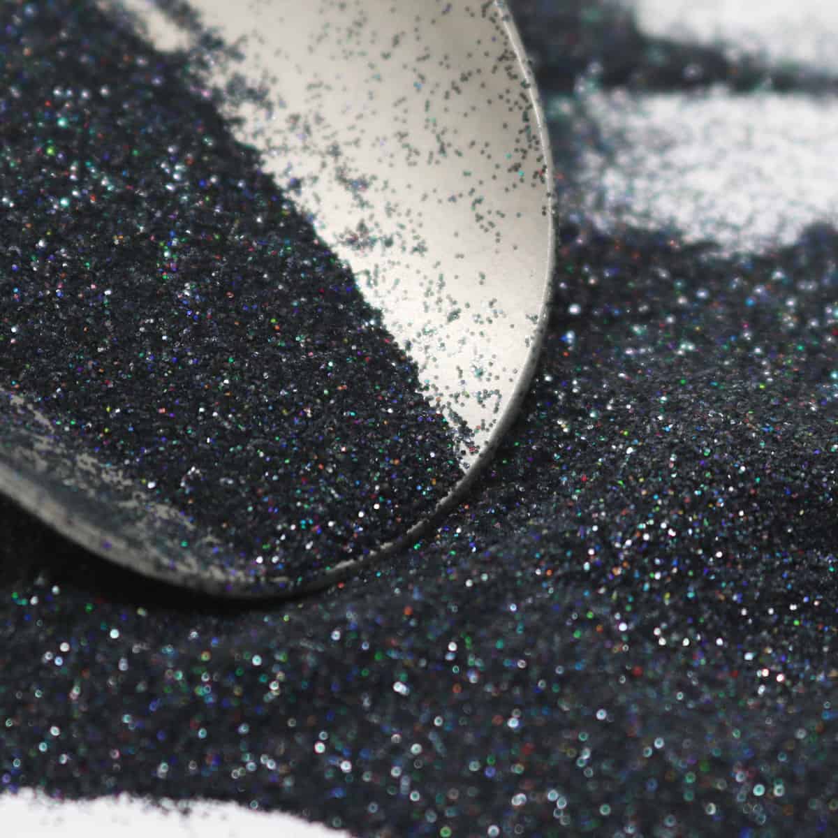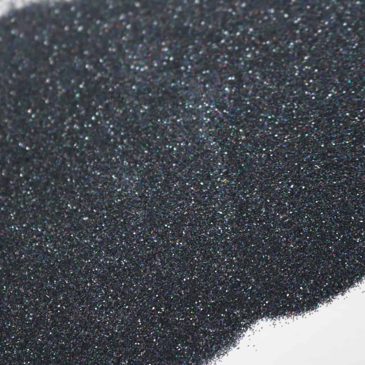 Quasar is a fine glitter with very small colorful reflective particles. It’s underlying body is black, however it is loaded with color. Lots of rich jades, deep blue, violet, orange, pink, and yellow can all be reflected back under certain light angles and intensities. This glitter is mainly black but the pops of color also make it very unique. It doesn’t change much in color and reflectiveness if used over light or dark backgrounds.
