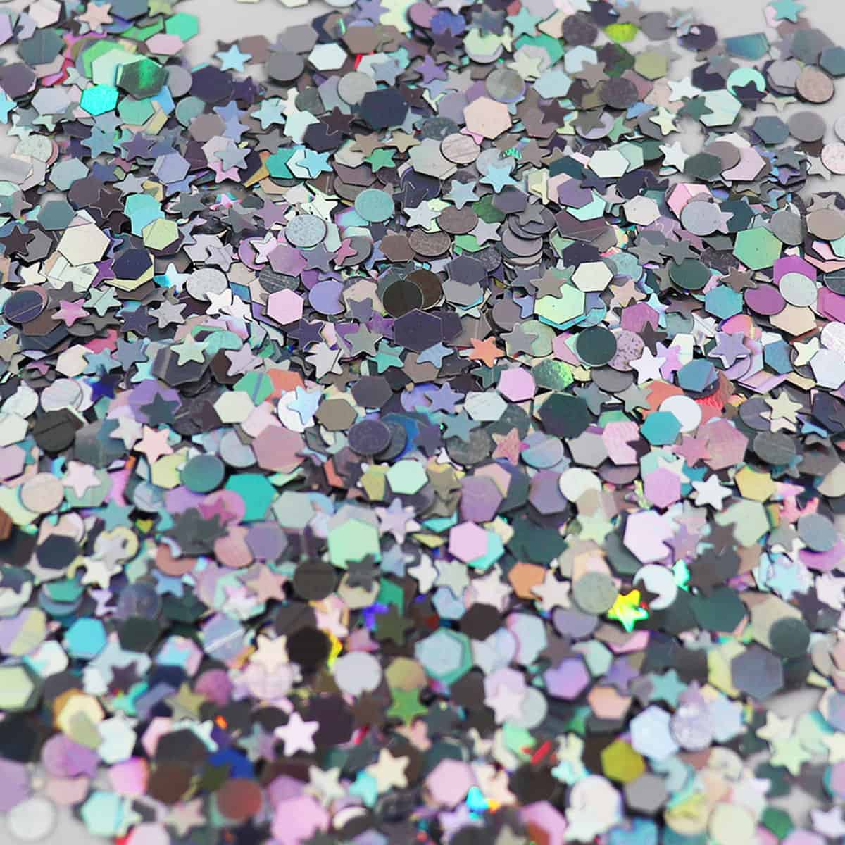 Seeing Stars is a beautiful silver metallic glitter with varying shapes of a similar large chunky size. It contains hexagons, stars, and circles creating a lovely variety. The reflective properties of this glitter creates a rainbowing effect allowing this glitter to fit in nicely with any color scheme. The greater the light intensity the greater the rainbow effect.