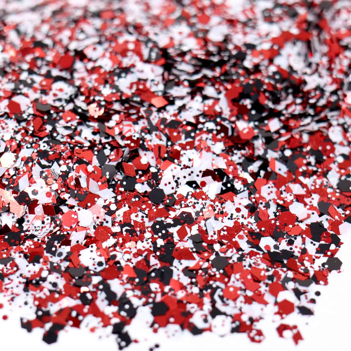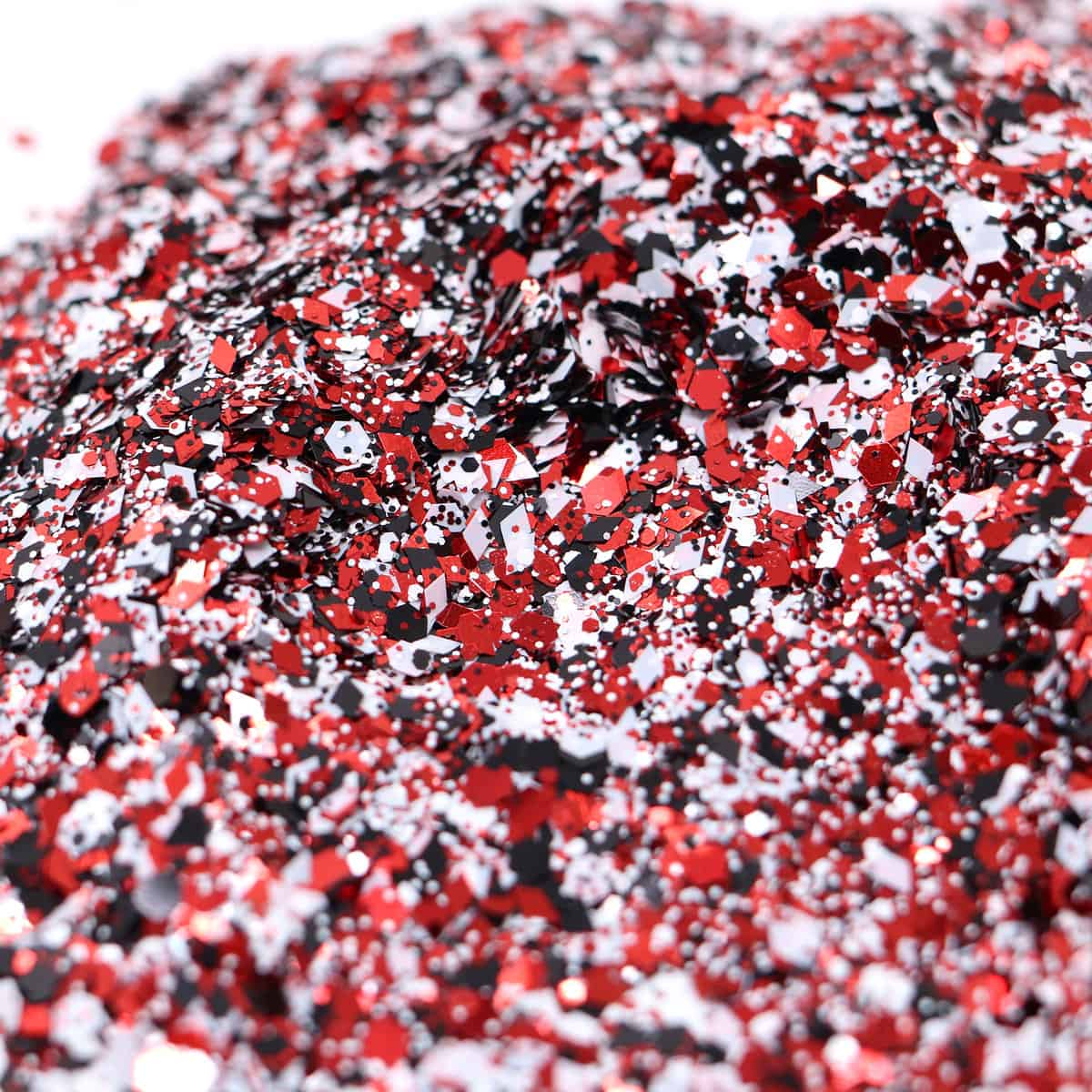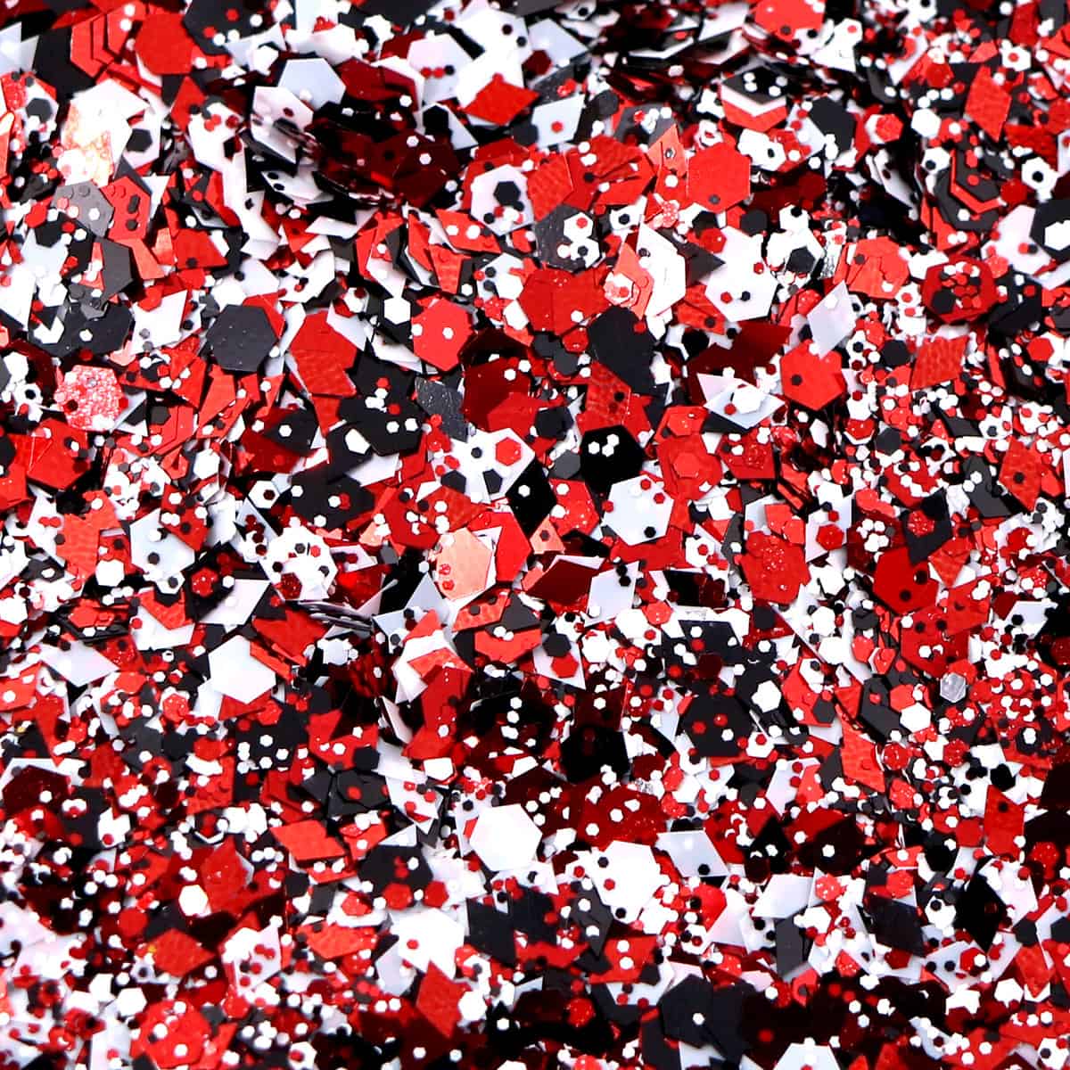 Spades is a glitter with very small red, black and white fine particles, medium hexagonal-shaped flakes, and large hexagonal and diamond-shaped flakes. This glitter is a great mix of all three colors in different sizes.