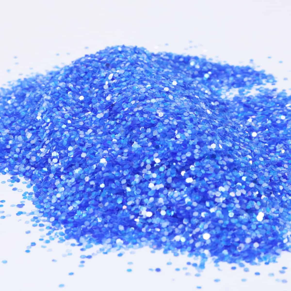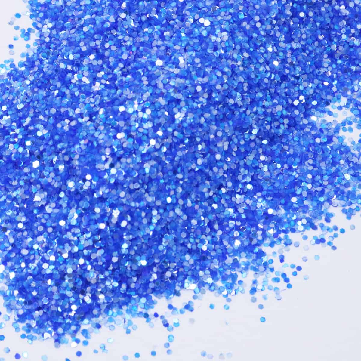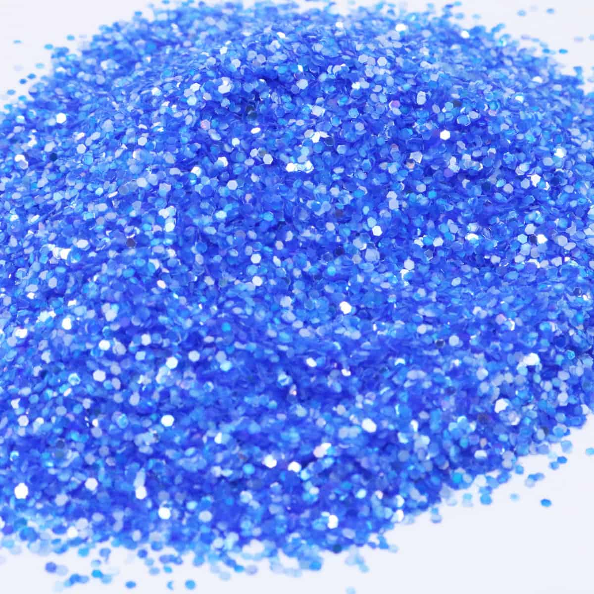 Varsity Blue is a medium sized blue-bodied glitter with transparent flakes. The colors range from a bright brilliant royal blue to soft highly hues light blues. The flakes are hexagonal shaped and have subtle soft purples/lilac hues that can be seen as well. This glitter loses its intensity with light applications.