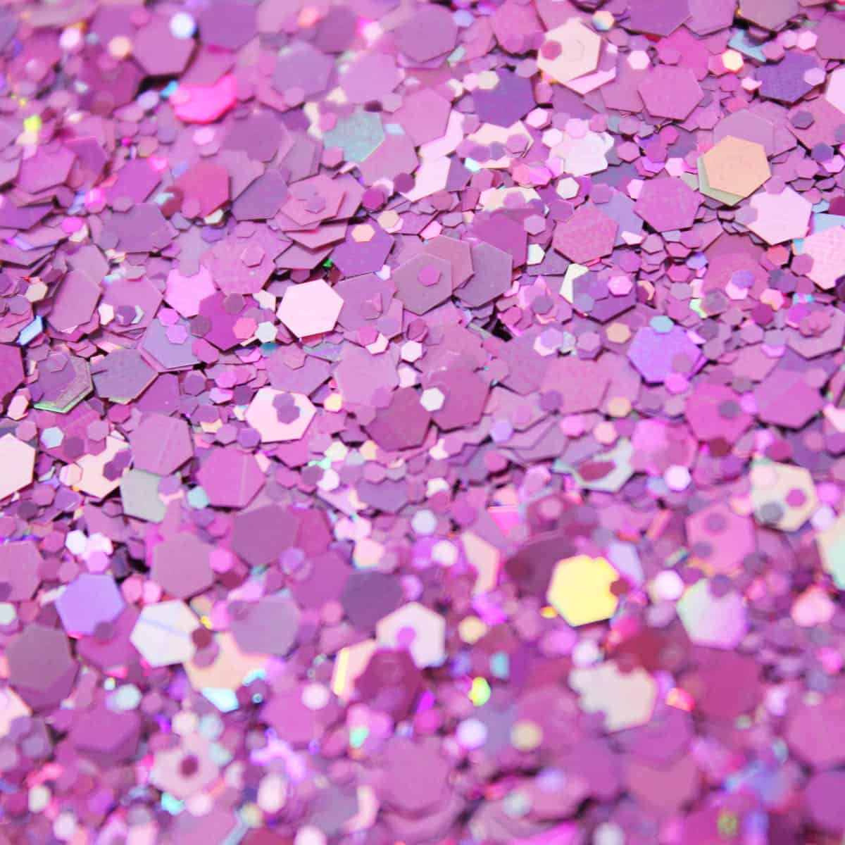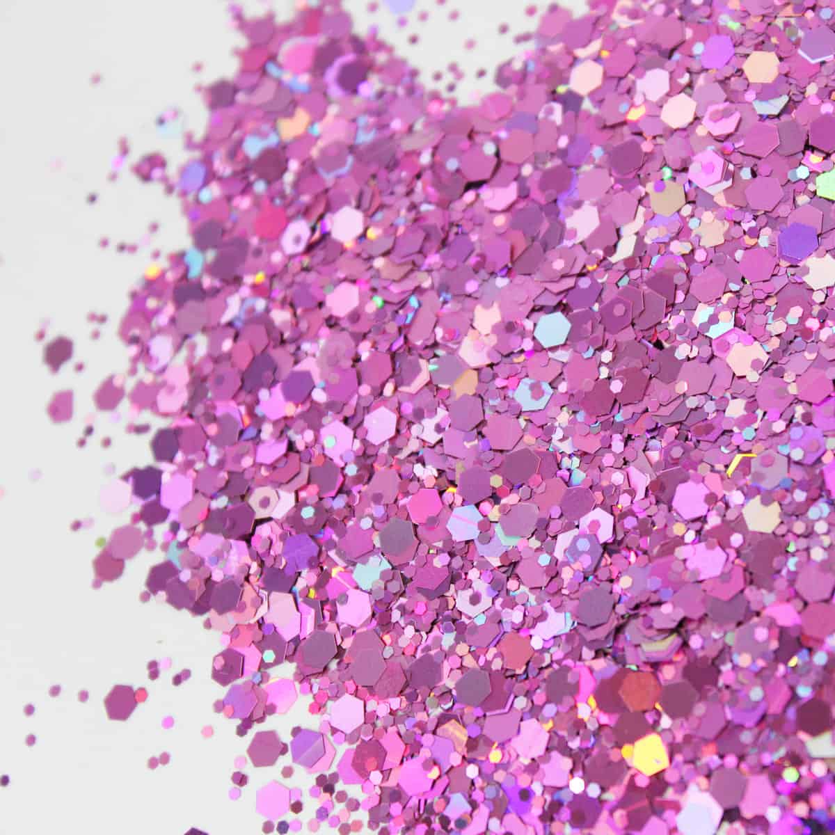 Whimsy is a pink/light purple varied glitter. It has large hexagonal flakes and small hexagonal flakes. It displays beautiful hues of yellow, lime green, orange, emerald green, red, bright pink, and a light to a dark cobalt blue. It has a strong reflective property that really makes the rich hues pop while maintaining a soft feel as the main body isn’t overbearing in hue. It’s very consistent over white and dark backgrounds.