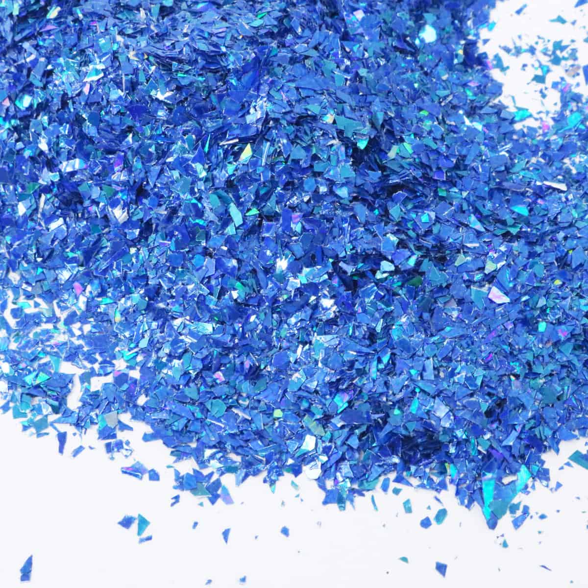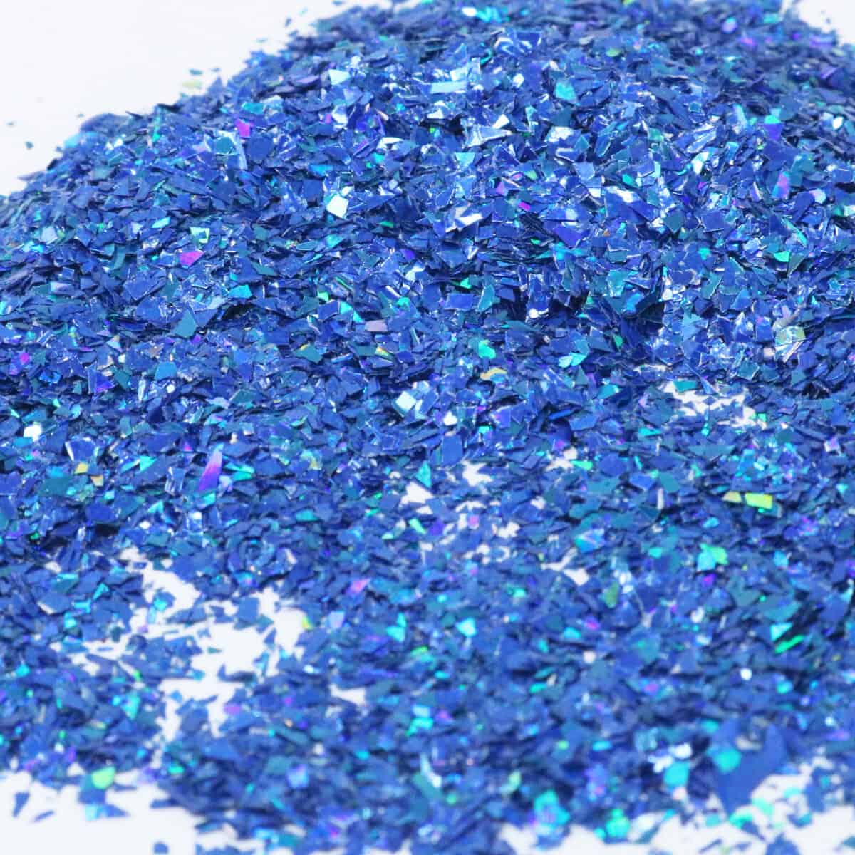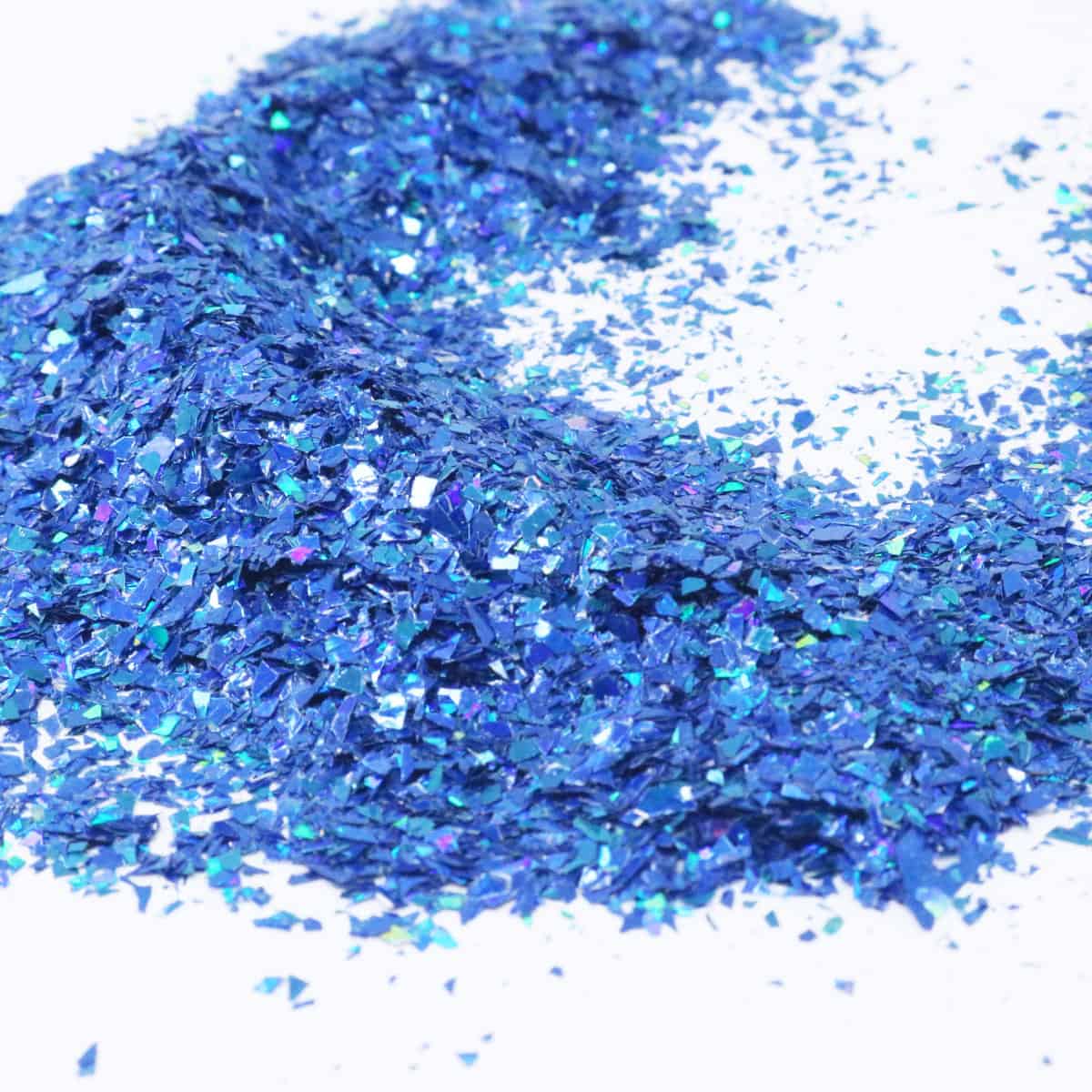 Barracuda is a vibrant metallic rich blue glitter with a rainbow sheen. This glitter is inconsistent in flake sizes ranging from fine to large. Flakes have sharp jagged edges making this glitter perfect for a project needing some dimension. This glitter will retain its color over light and dark surfaces. Increased light intensity results in a richer rainbowing effect.