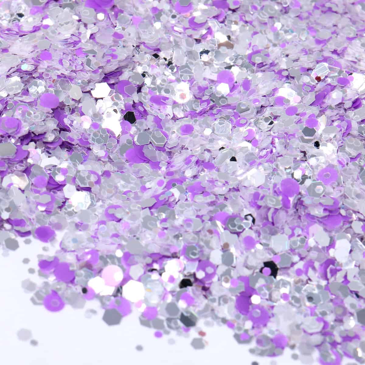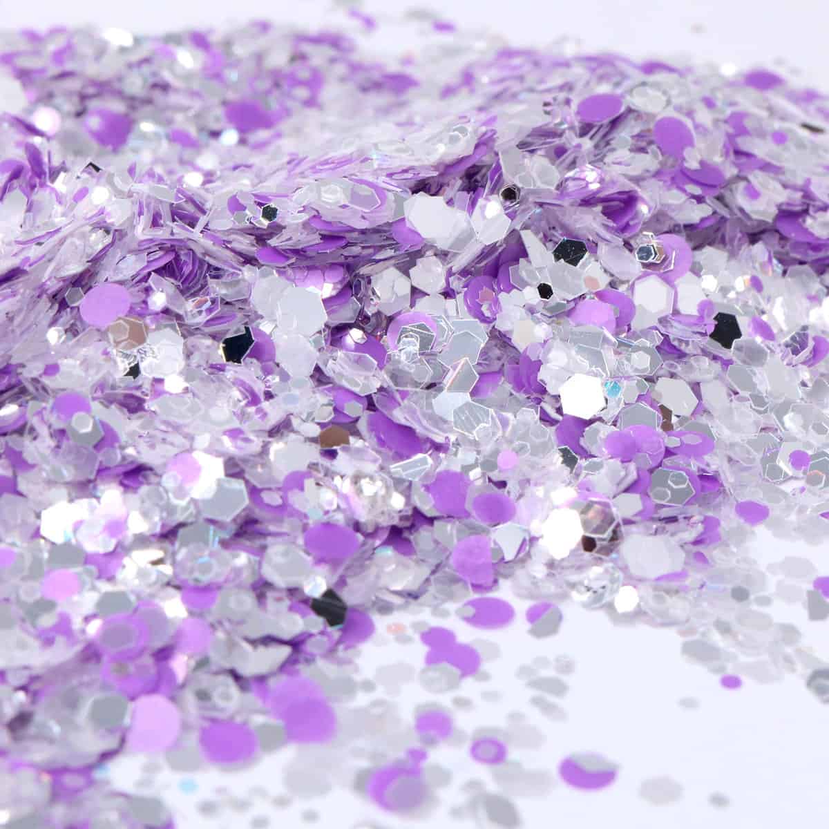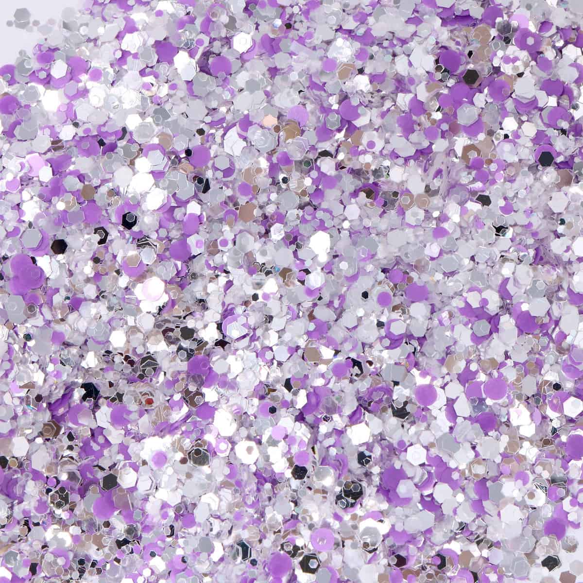 Bring It has a variety of flake sizes and colors. It has large hexagonal flakes that are opaque and reflective. It has mid-sized hexagonal shaped glitter that is also opaque and reflective. Finally, it has small dust-like flakes that add a little extra shimmer and dimension to the glitter. In close proximity the glitter appears mostly purple and white with translucent pieces.