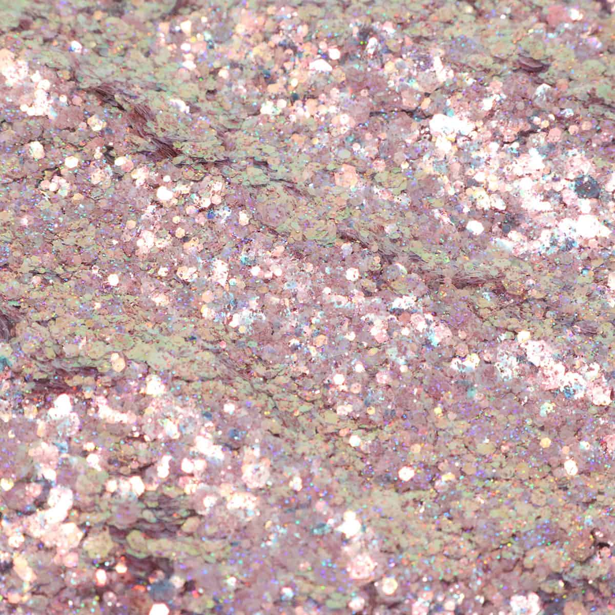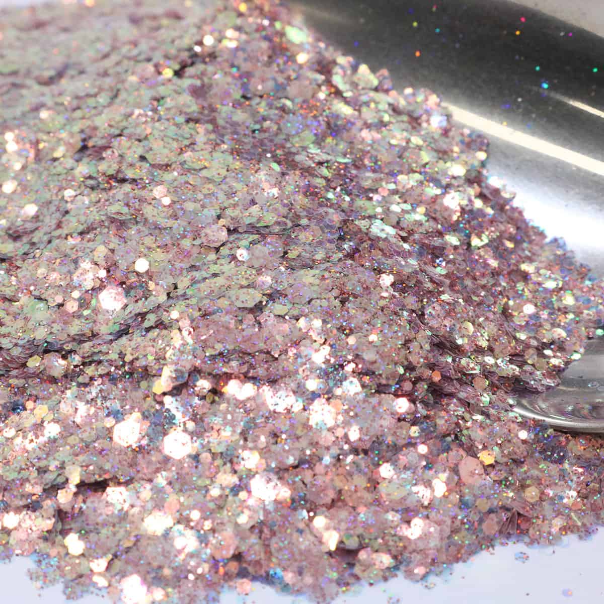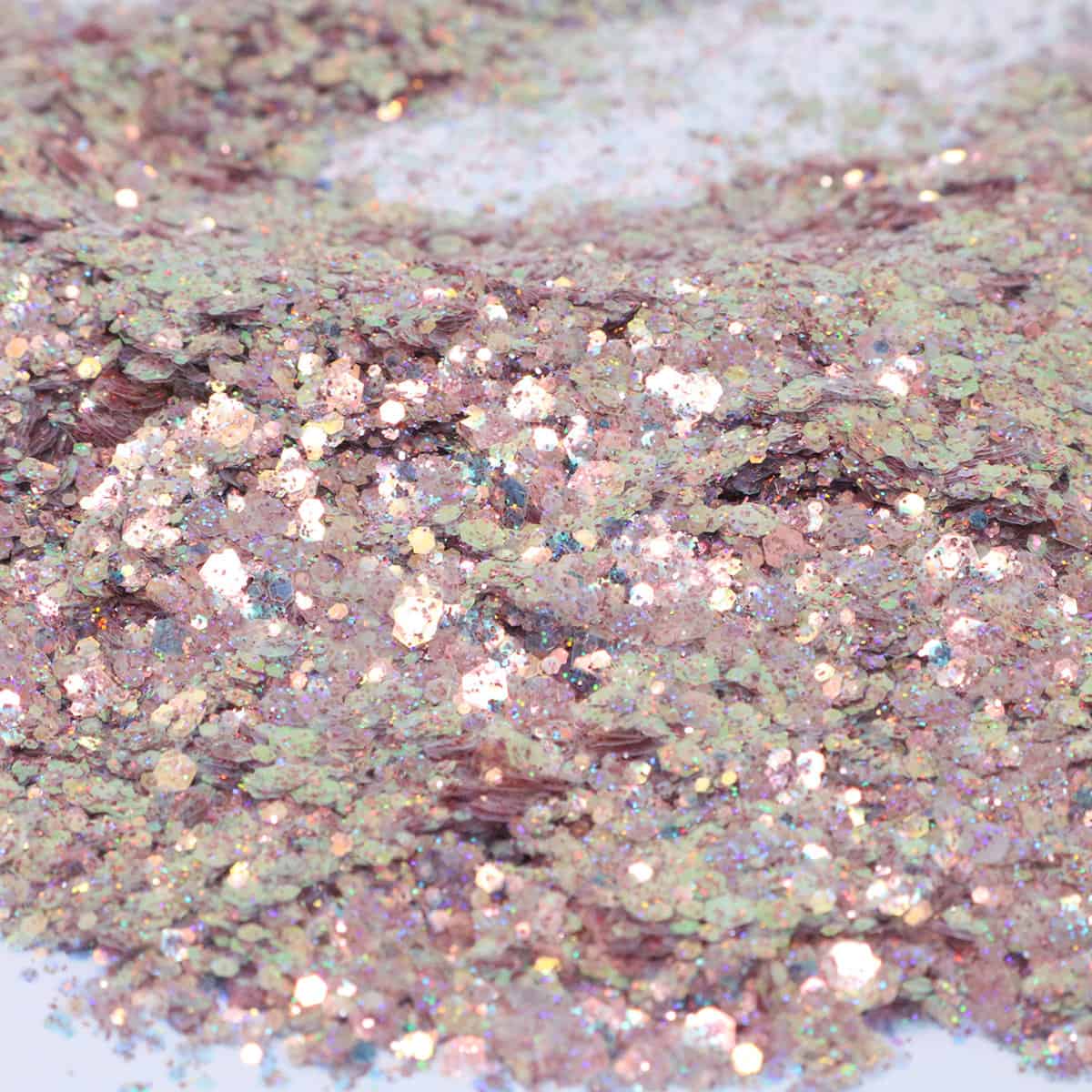 Desert Canyon is light rich brown based glitter with fine to mid-sized flakes that are hexagonal shaped. This glitter has a wide range of hues due to its holographic qualities. Thicker applications result in more color. Expect lots of rainbowing hues from this glitter along with soft blue hues with thin applications.