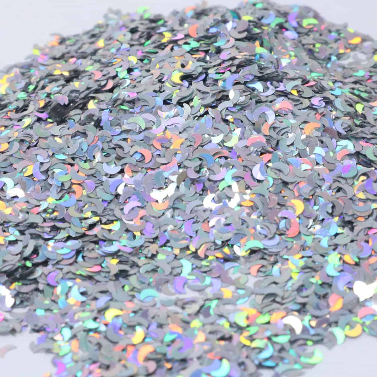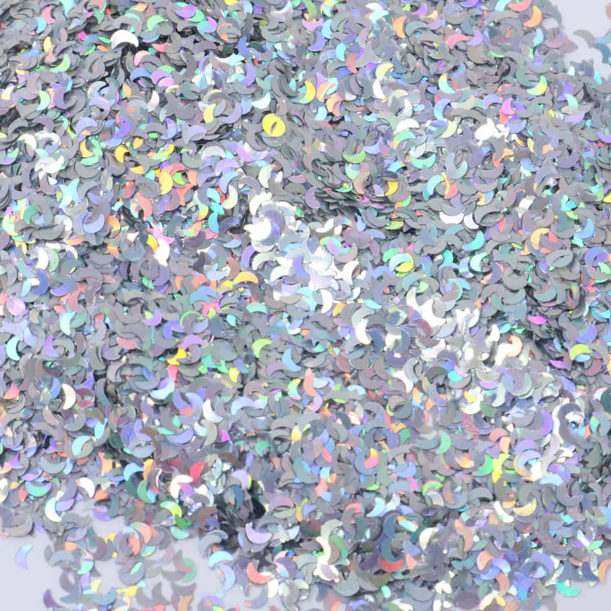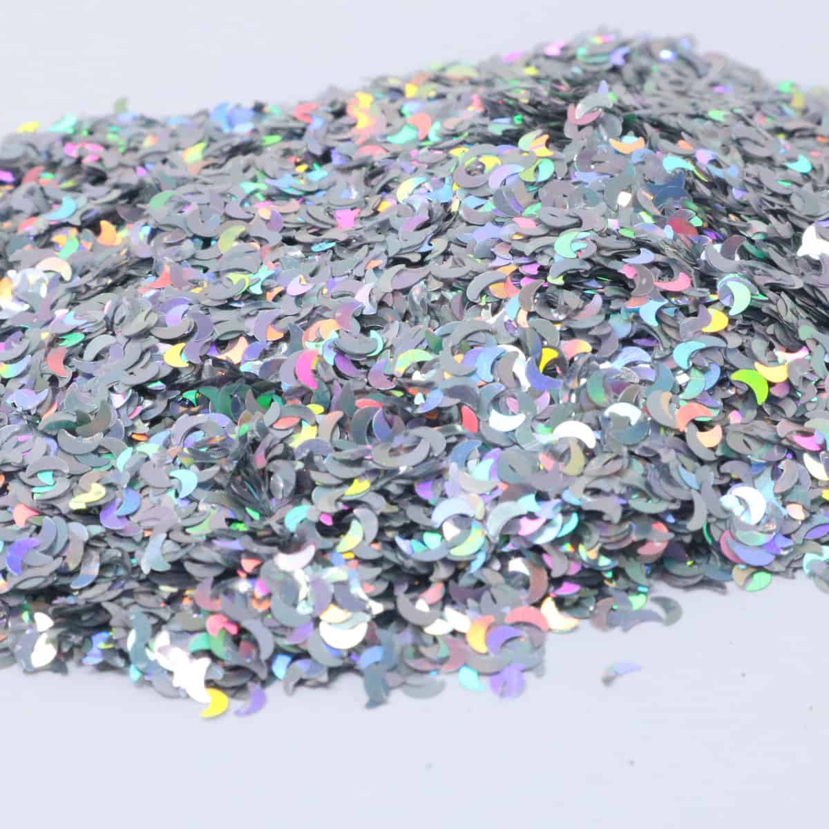 Eclipse is a silver metallic glitter with medium crescent moon-shaped flakes. This glitter displays soft rainbow hues which increase in vibrancy with light intensity. It will display its color evenly over dark or light backgrounds.