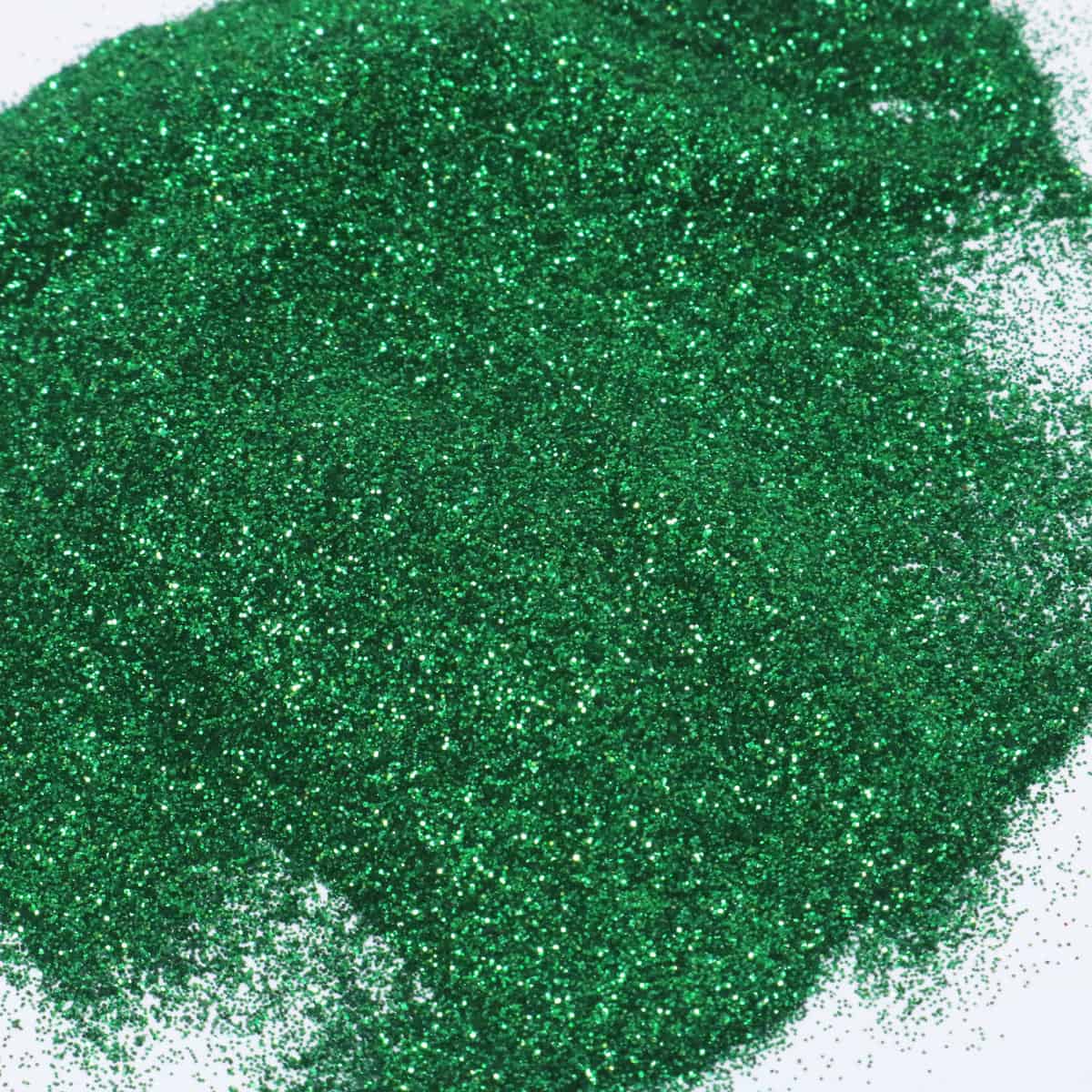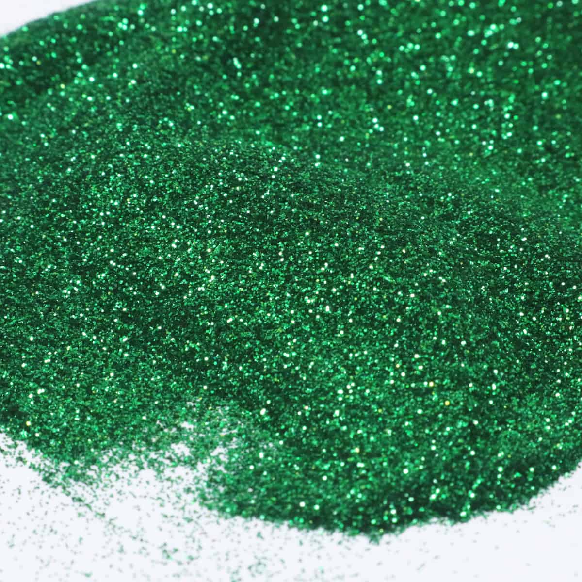 Evergreen is a rich green glitter with a metallic sheen. This glitter is fine with consistent flake sizes with variants of light to dark green depending on light angle and intensity. This glitter has metallic flakes and will retain its reflective properties over dark and light backgrounds.