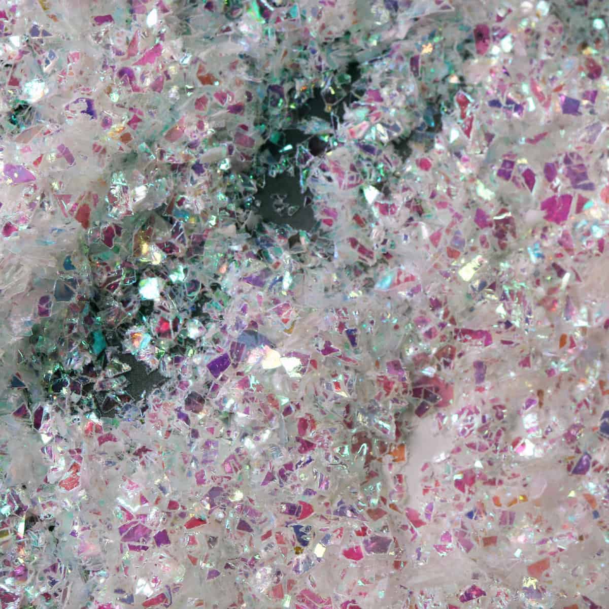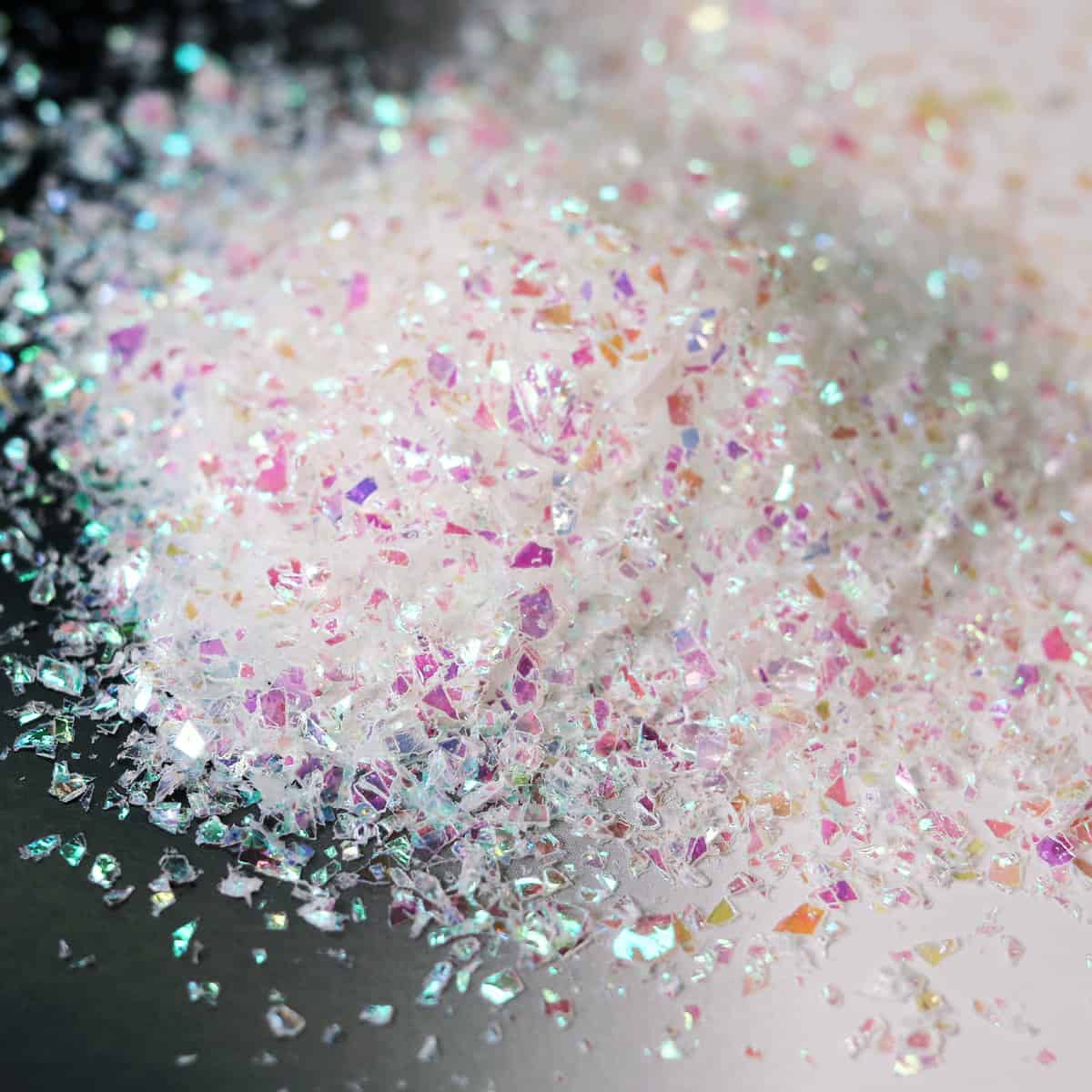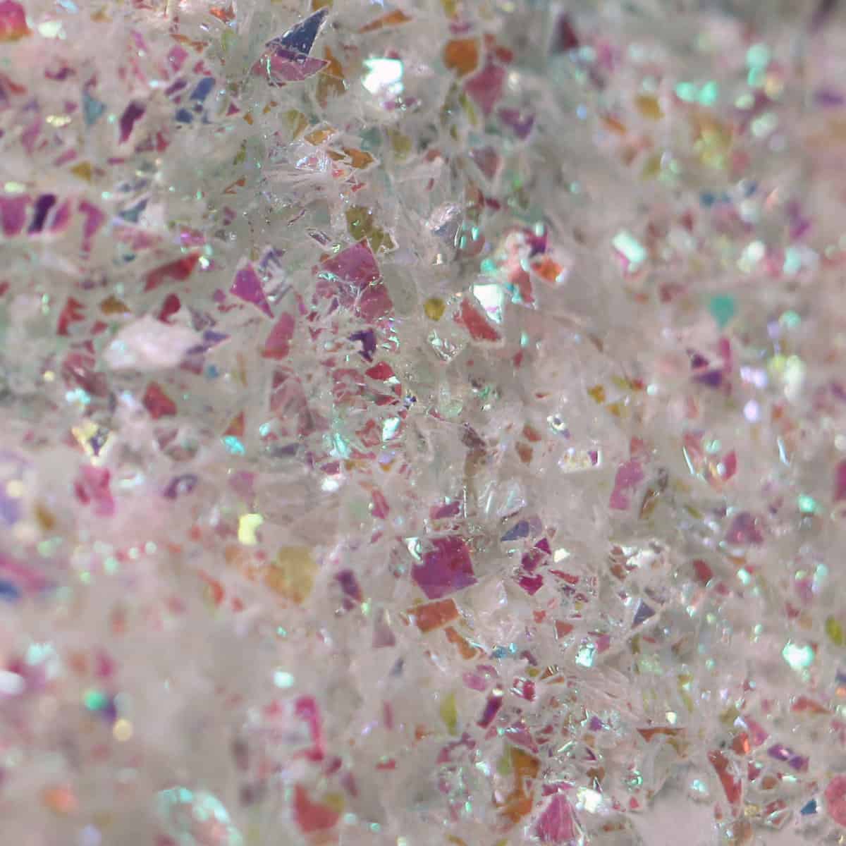 Fabulous Frost flakes vary in sizes and colors. These opaque and reflective flakes are triangular and jagged. In close proximity the glitter appears mostly white with soft pastel colors of light green, light blue/blueish green, light pink, and light purple. These flakes are opaque and reflective and have entirely different looks over white and dark backgrounds. Over a dark background, you can expect more greens and yellows to pop out, while a white background allows for the pinks and purples to make their appearance.
