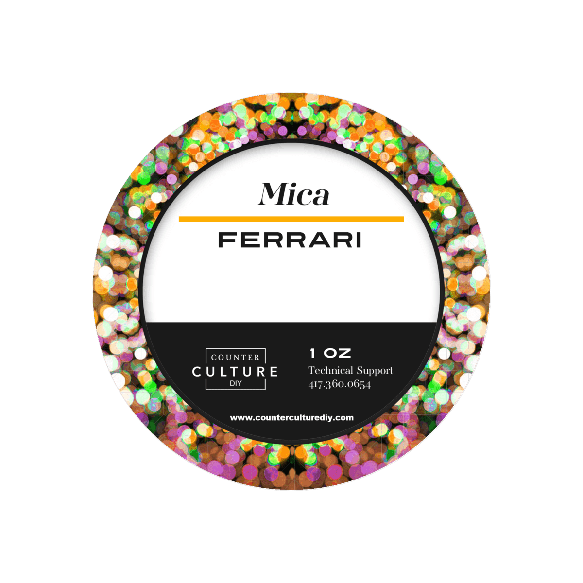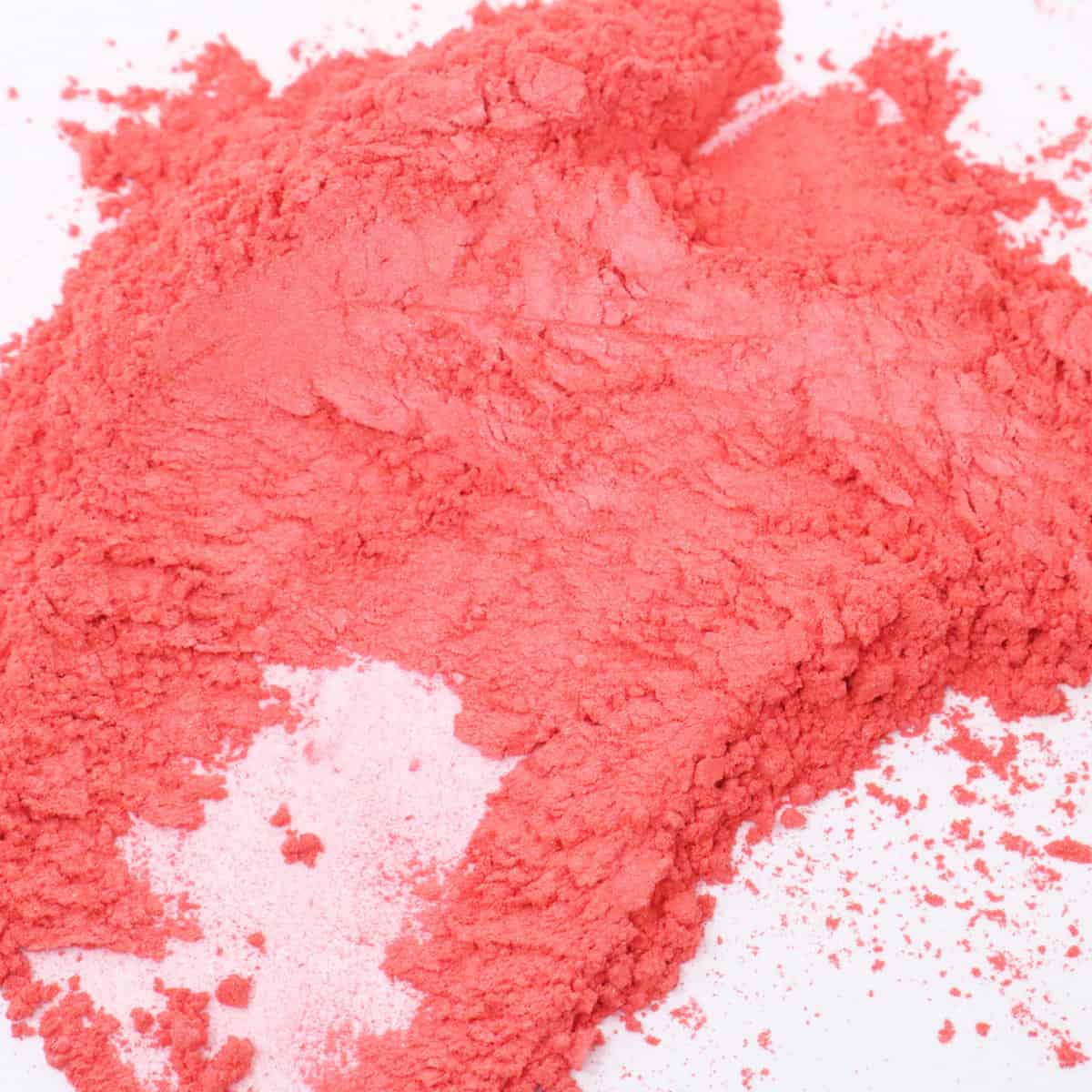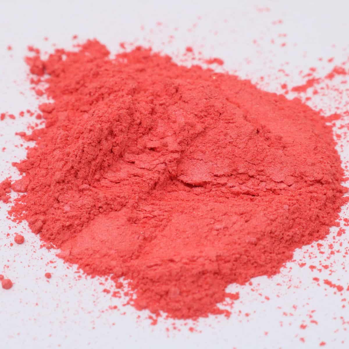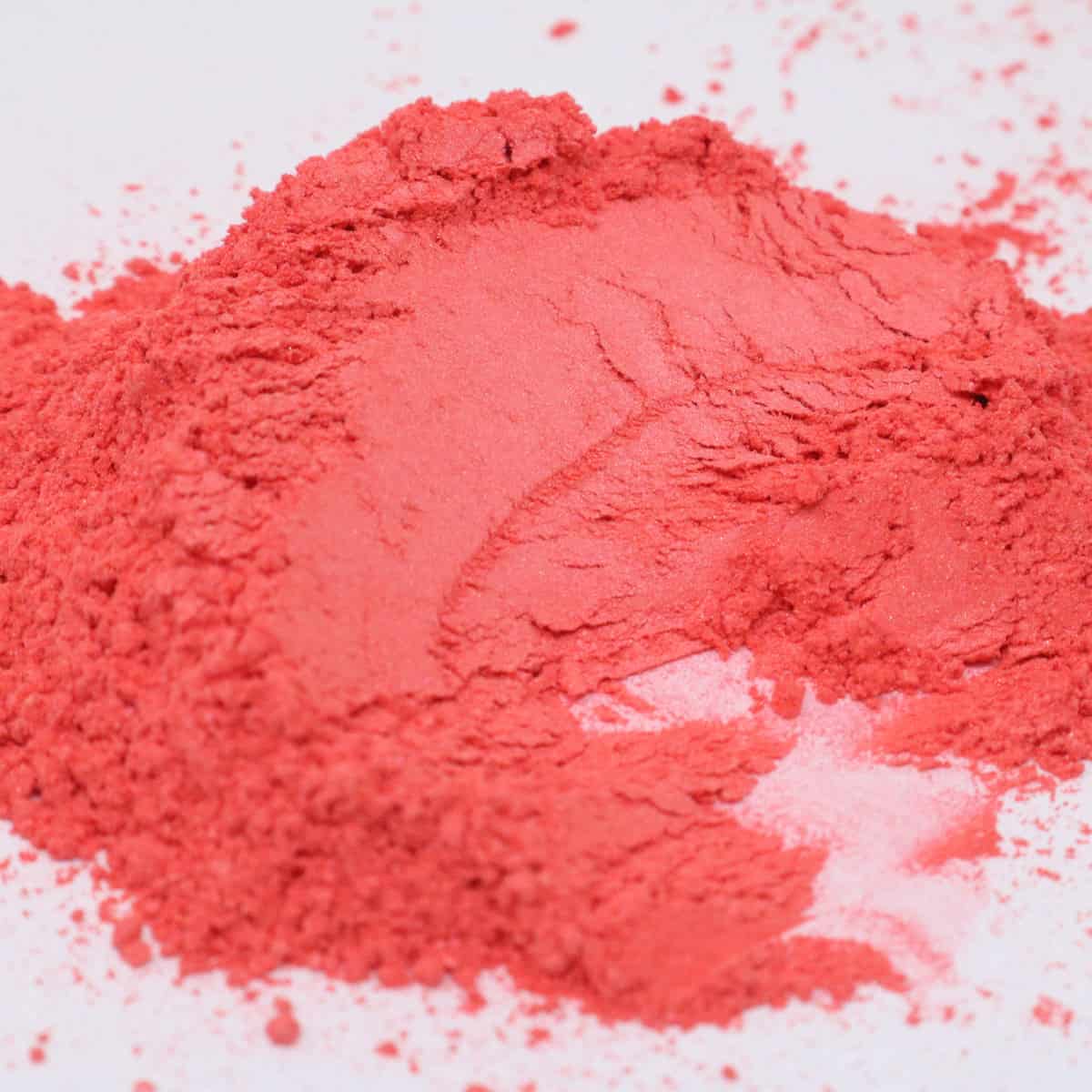 Ferrari is a bright coral red mica with a subtle shimmer. When compacted its shimmer becomes very apparent. Many hues of bright red can be seen from this lovely mica.