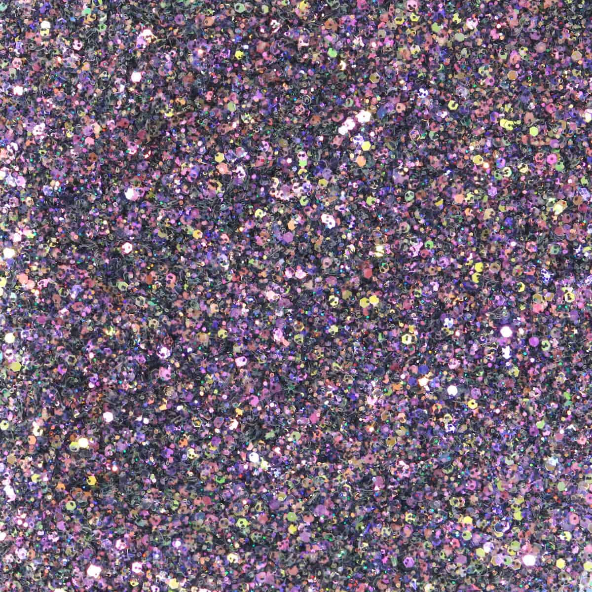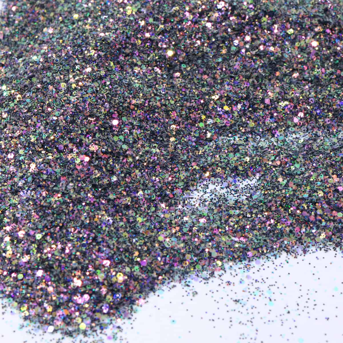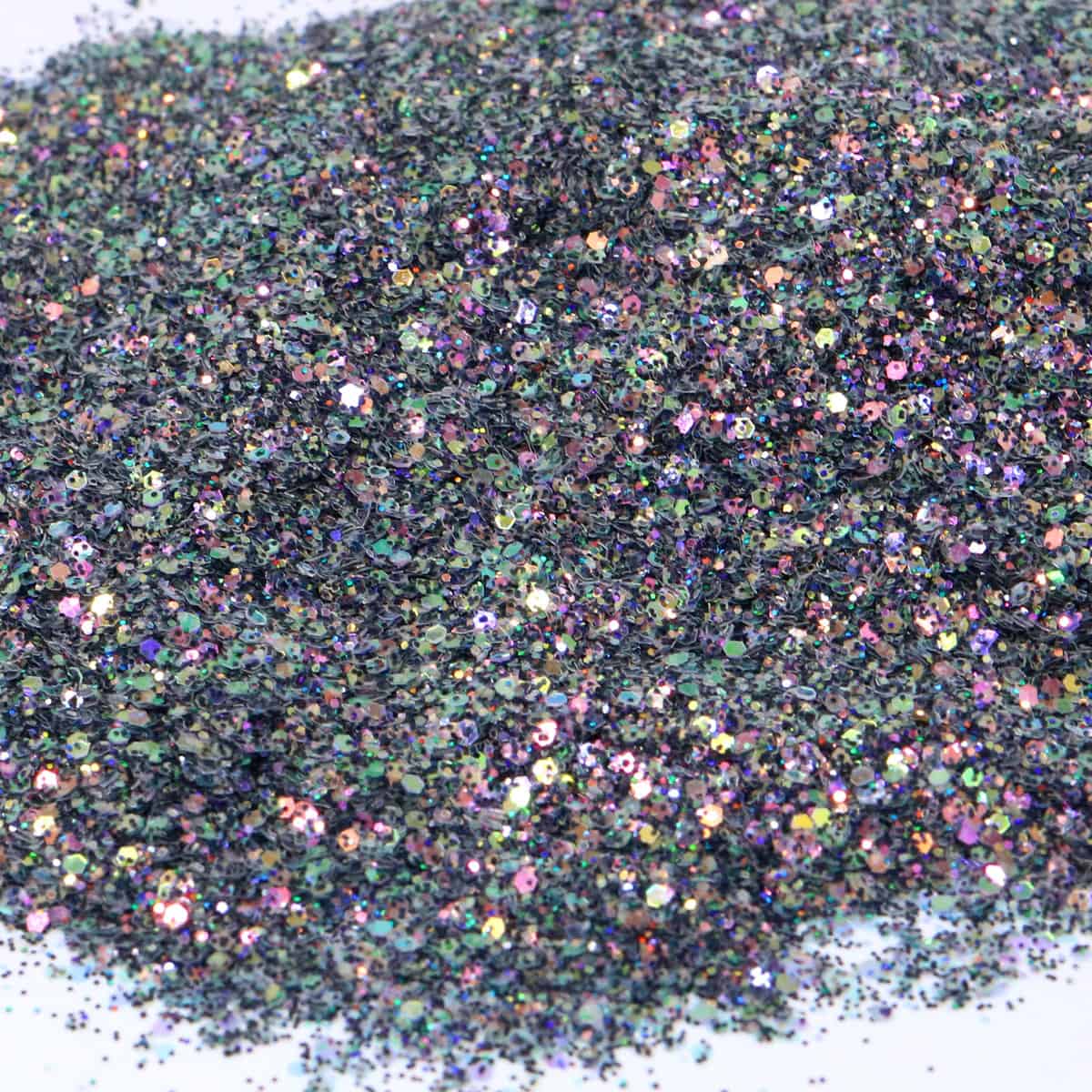 Foolish is a color-packed reflective glitter with large reflective hexagonal shapes, medium reflective hexagonal pieces, and fine multicolored reflective glitters. displays an array of colors . Hues that are easily seen are pinks, yellows, greens, blues, and purple – It is highly reflective with purple and multi-colored hues under any light intensity