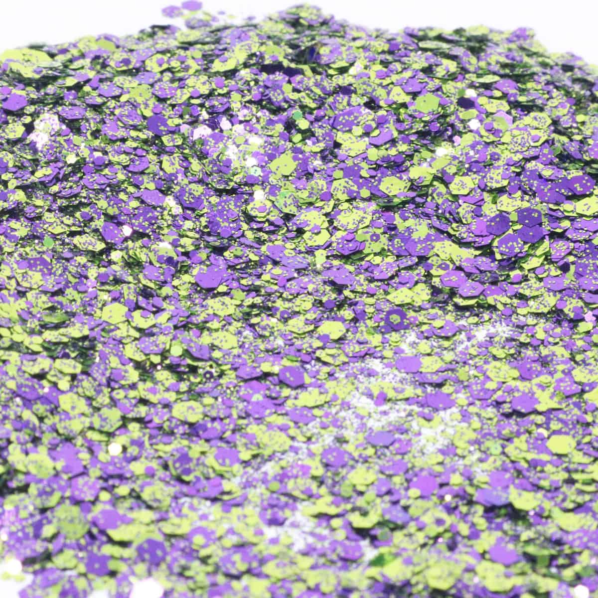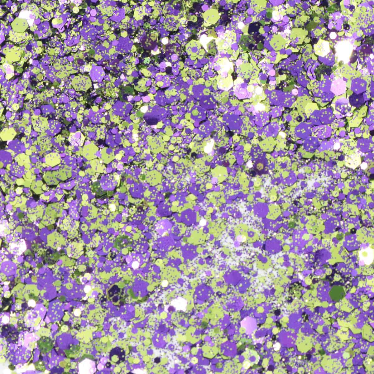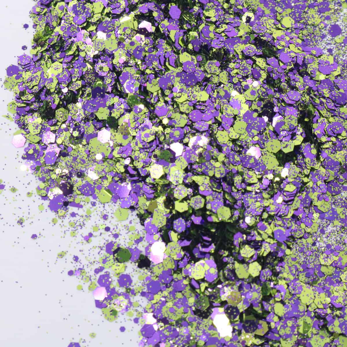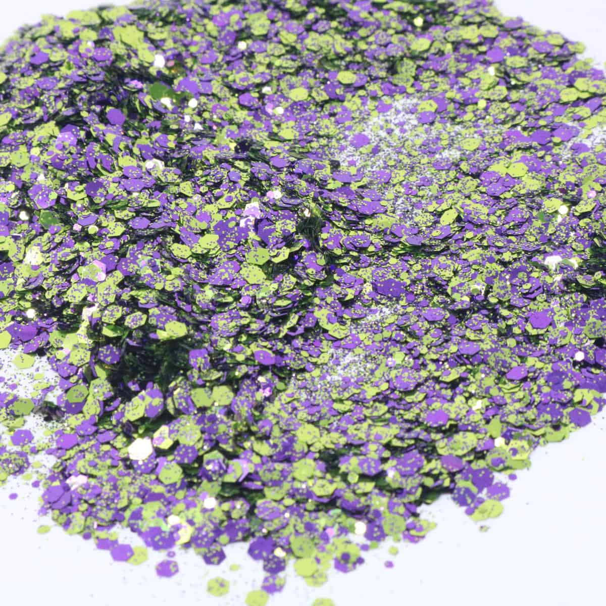 Frankenstein is a combination of a green and purple body of glitter. It has a lot of dimension from the varying flake sizes from fine, to medium, to large. The metallic flakes are hexagonal-shaped. This glitter is a great addition for a halloween-themed project or a fun merge of two strong reflective hues.