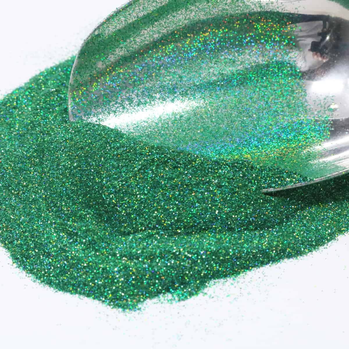 Garland Green is a beautiful fine green glitter with a rainbow reflection. The main glitter body is green with vibrant pops of color across the rainbow. The reflective flakes are metallic and will retain their color over light and dark surfaces.