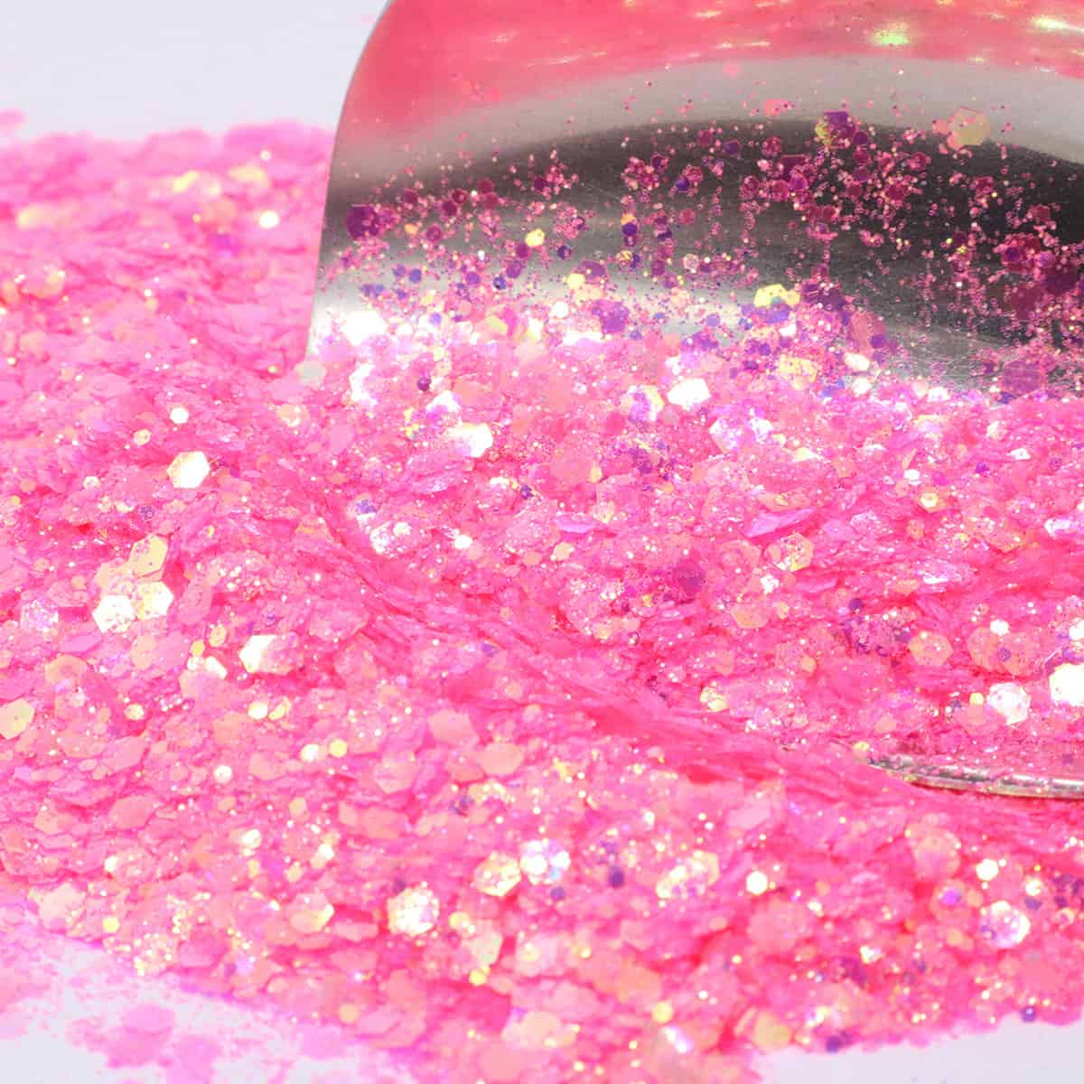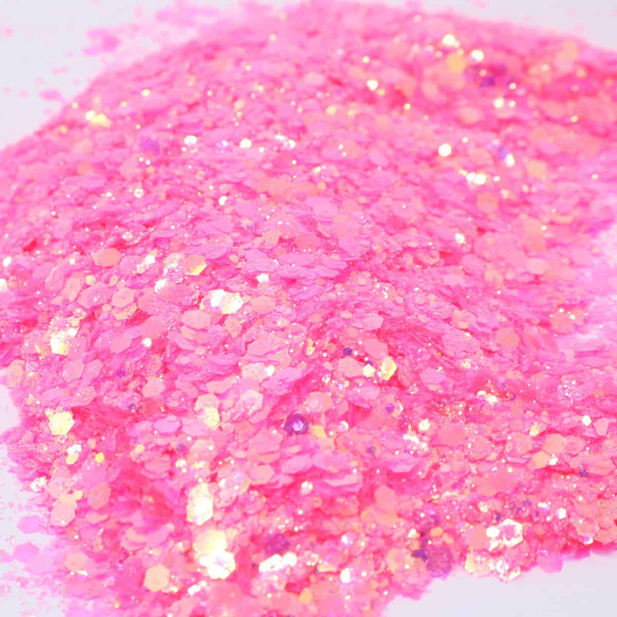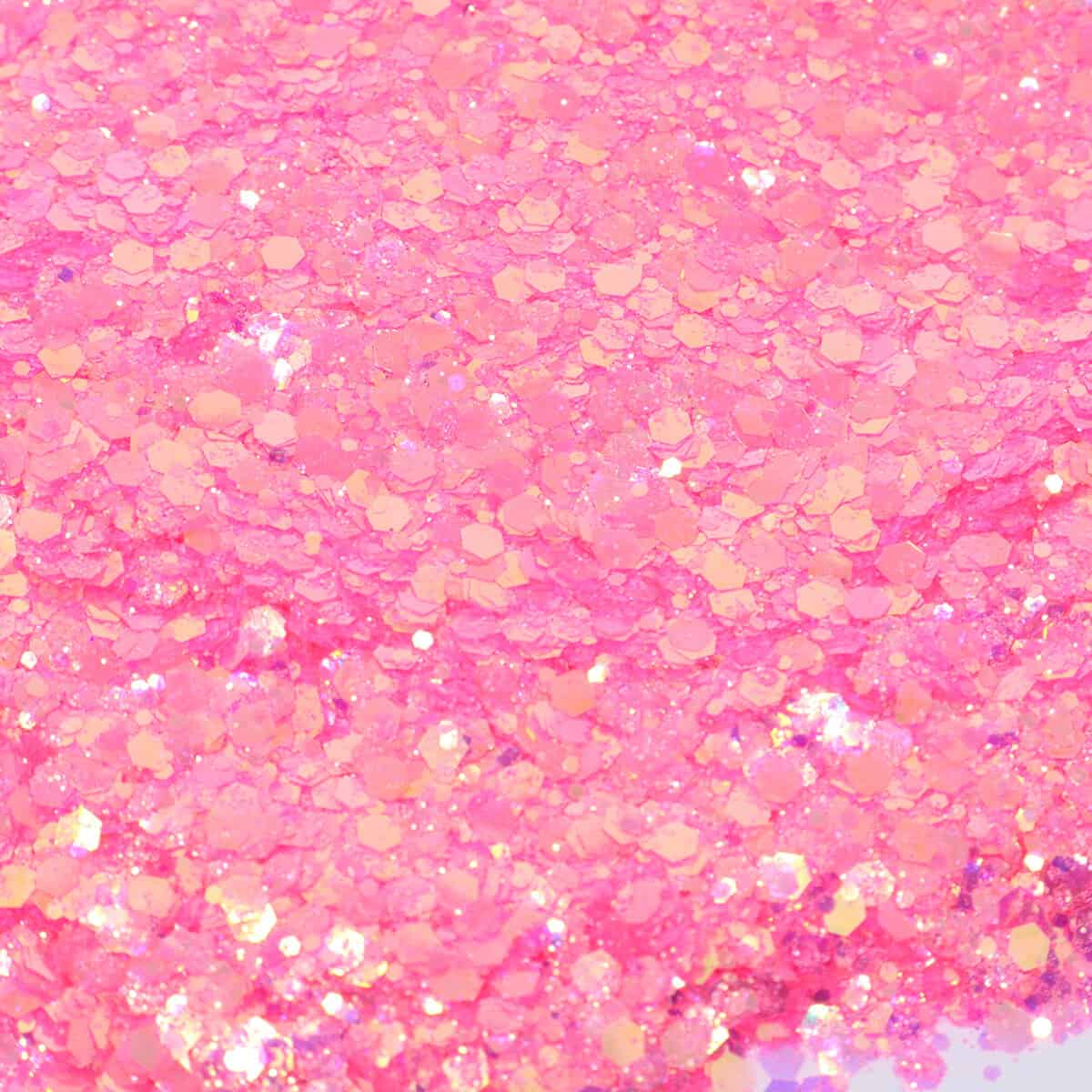 Girls Day is a bright vibrant pink based glitter with fine to mid-sized flakes that are hexagonal shaped. This glitter has plenty of added hues ranging from light yellow to a soft purple. It’s iridescent qualities result in it appearing stronger in hue over dark thick applications over white and thin uses.