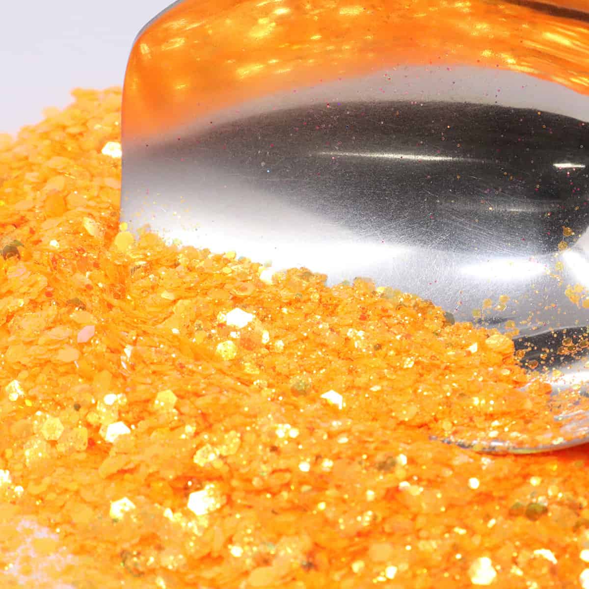 Golden Goddess is on fire! This bright orange/yellow based glitter with fine to mid-sized flakes that are hexagonal shaped. This glitter has a wide range of light yellow to dark orange hues. It’s holographic qualities result in it being more vibrant with thicker applications.
