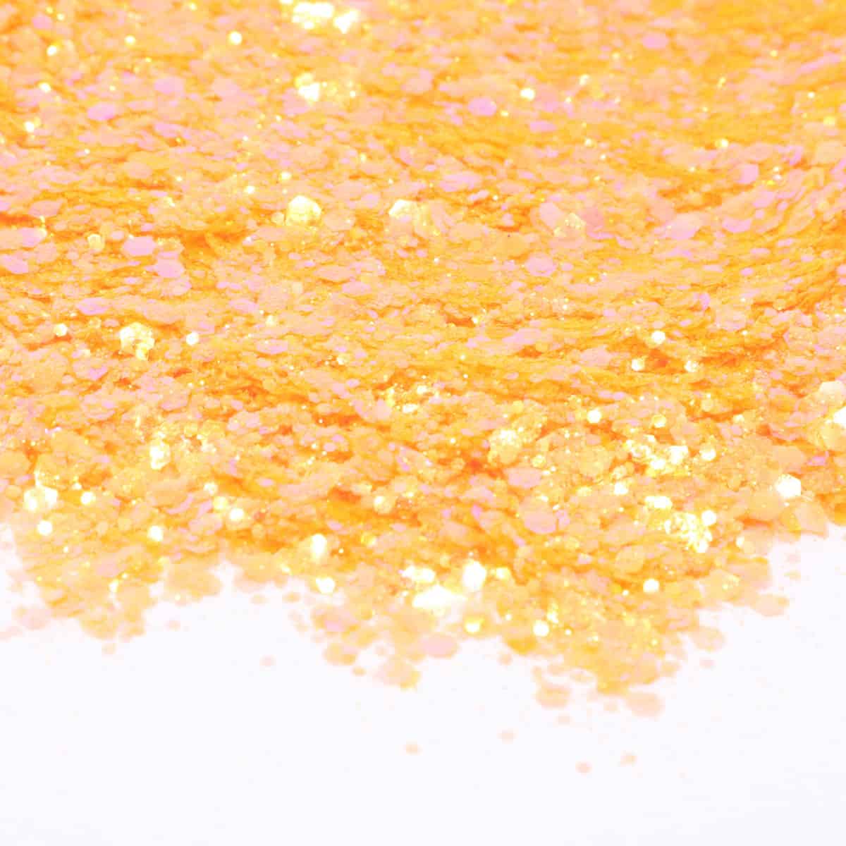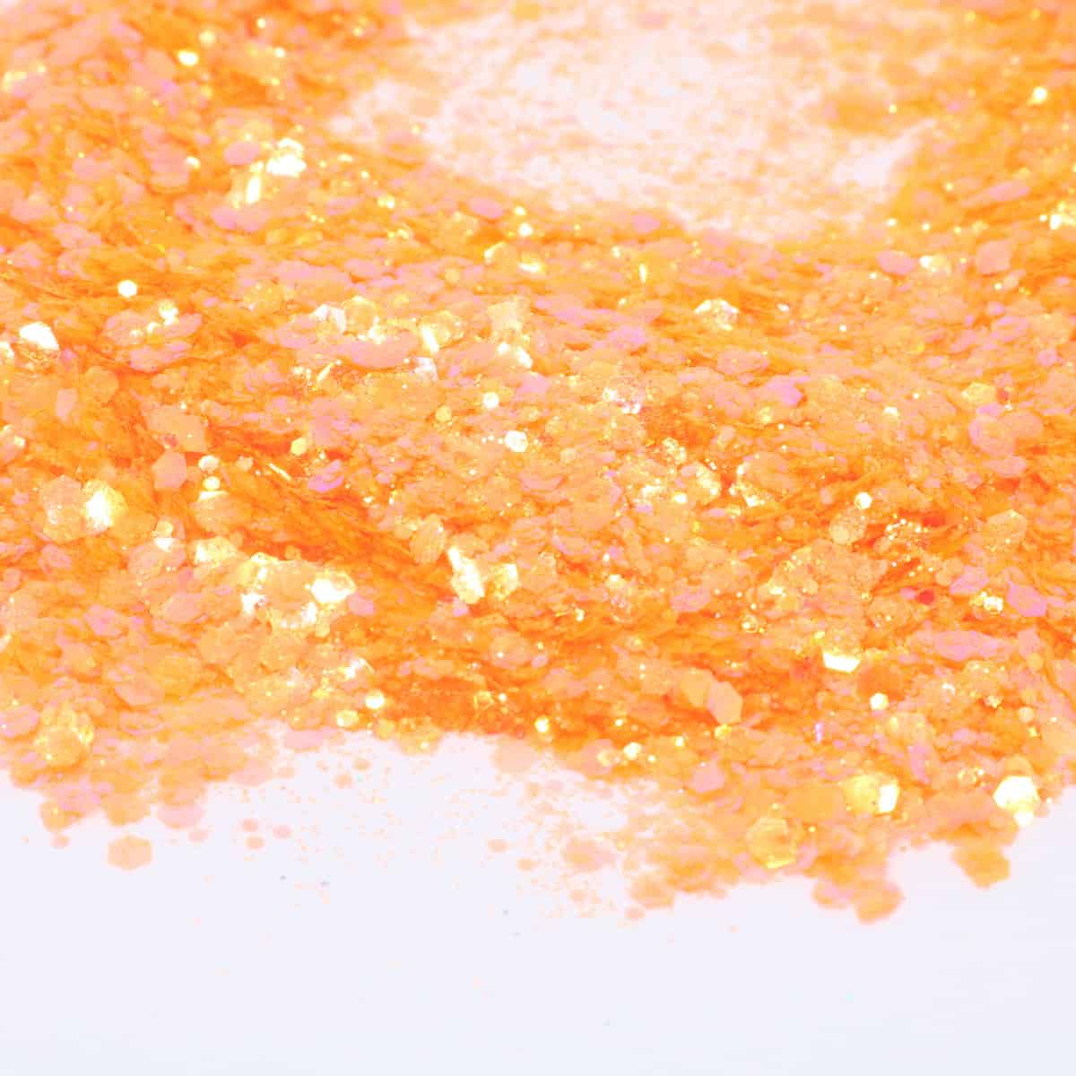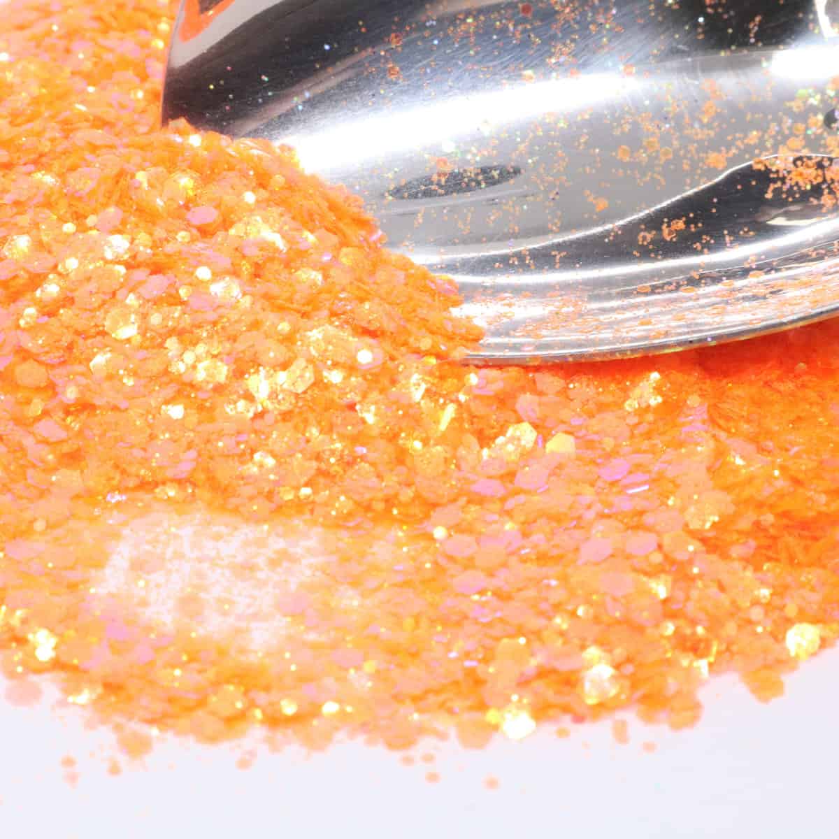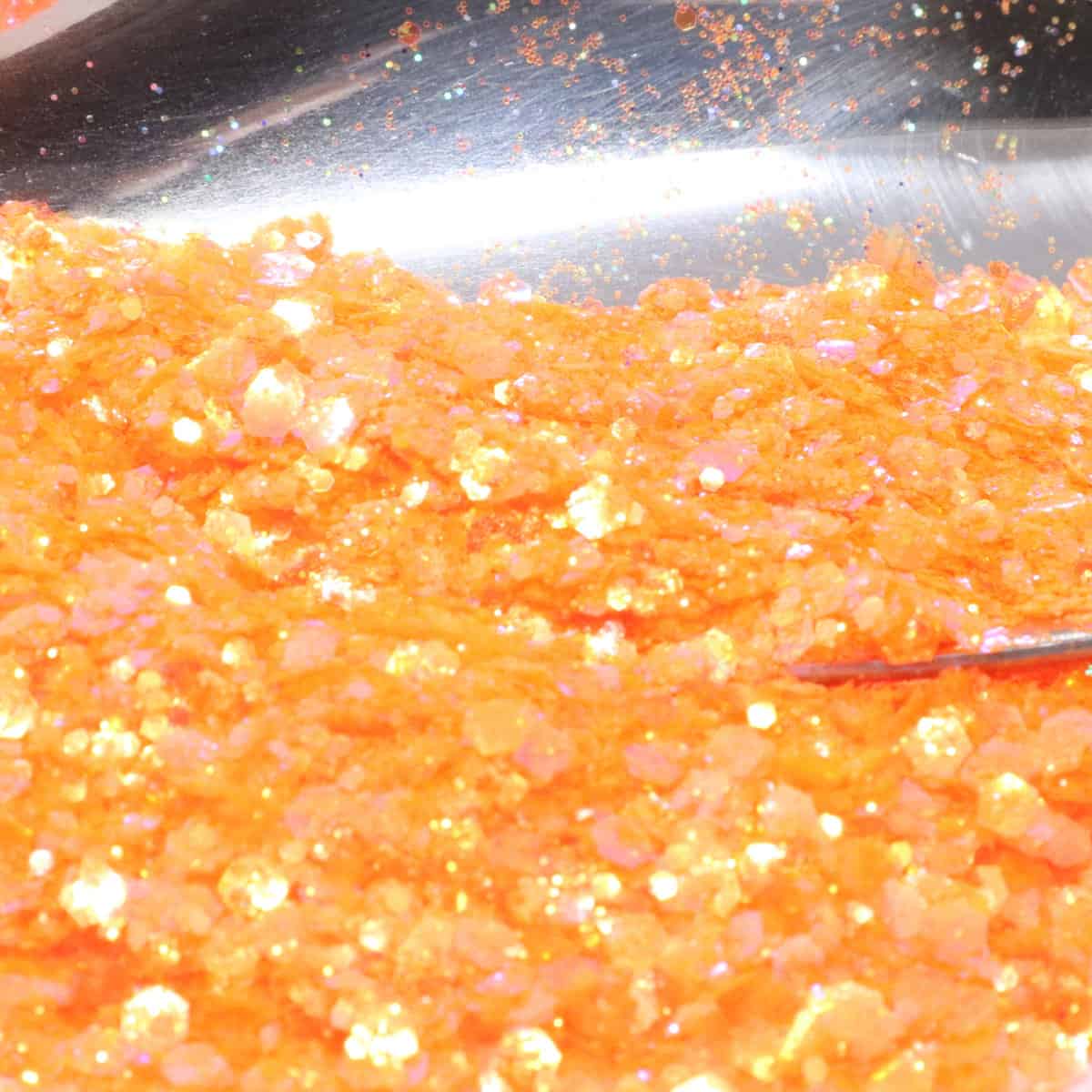 Merigold is fiercely color-packed translucent orange glitter. It has a wide variety of flake sizes from large, to medium, to fine – all hexagonal-shaped. Reflected hues range from soft bright pinks, yellows, and orange. Lighter application resulted in a lighter hue while thicker applications will display richer orange hues.