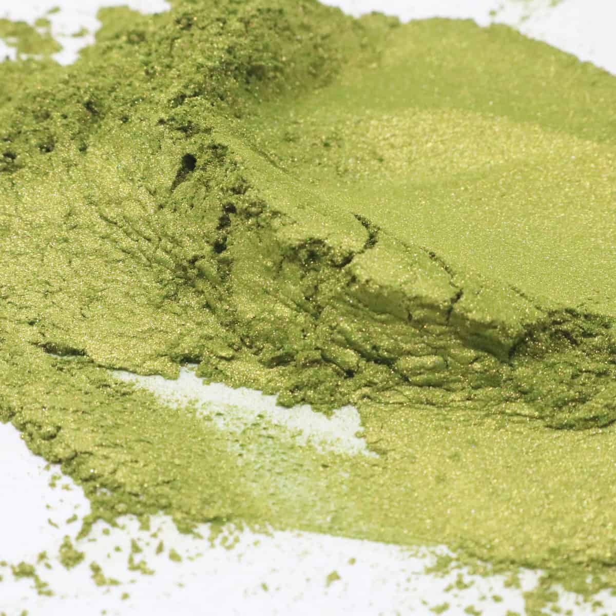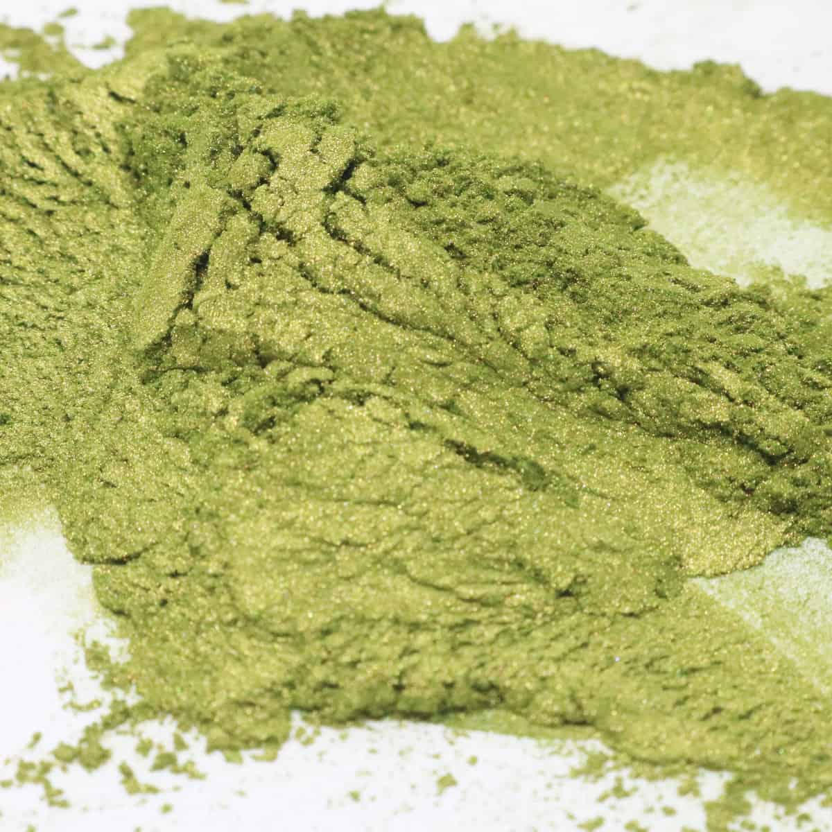 Olive is a medium dark neutral green mica with a vibrant gold metallic shimmer. This mica’s dark warm green body and gold shimmer give it a lot of variety and color. When compacted the gold metallic particles begin to become more prevalent – creating a bright gold/green reflective surface. Thin applications allow the rich neutral green hues to be visible with a shimmering bright metallic effect.