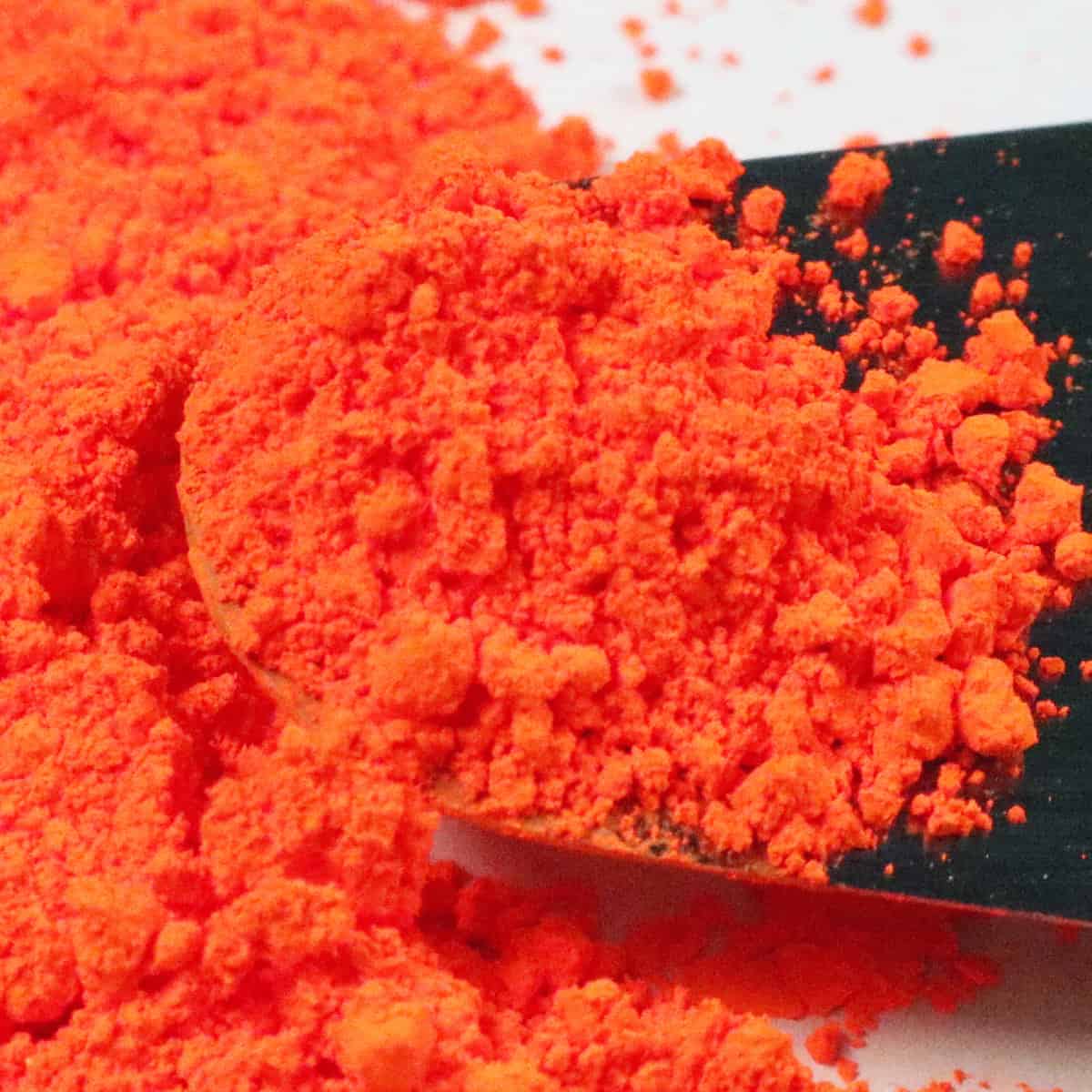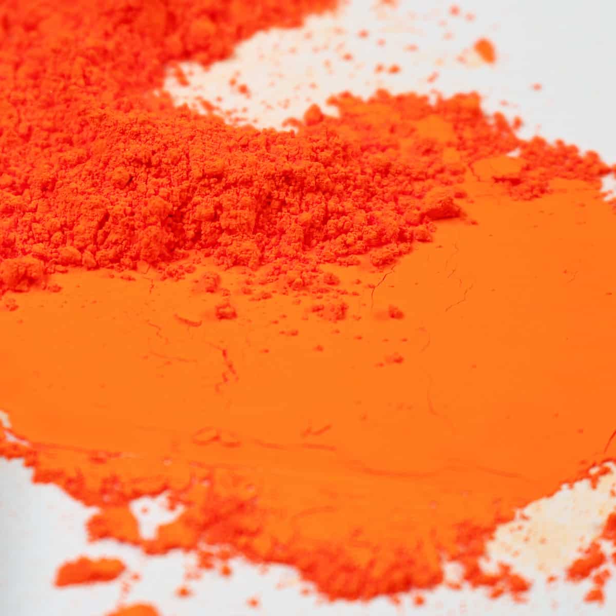 Velma is a orange neon color. It radiates its color and strengthens its luminosity when compacted. It is very bright. This pigment doesn’t lose its power over any light or dark background. Expect lots of color!