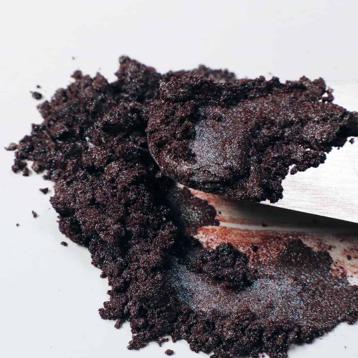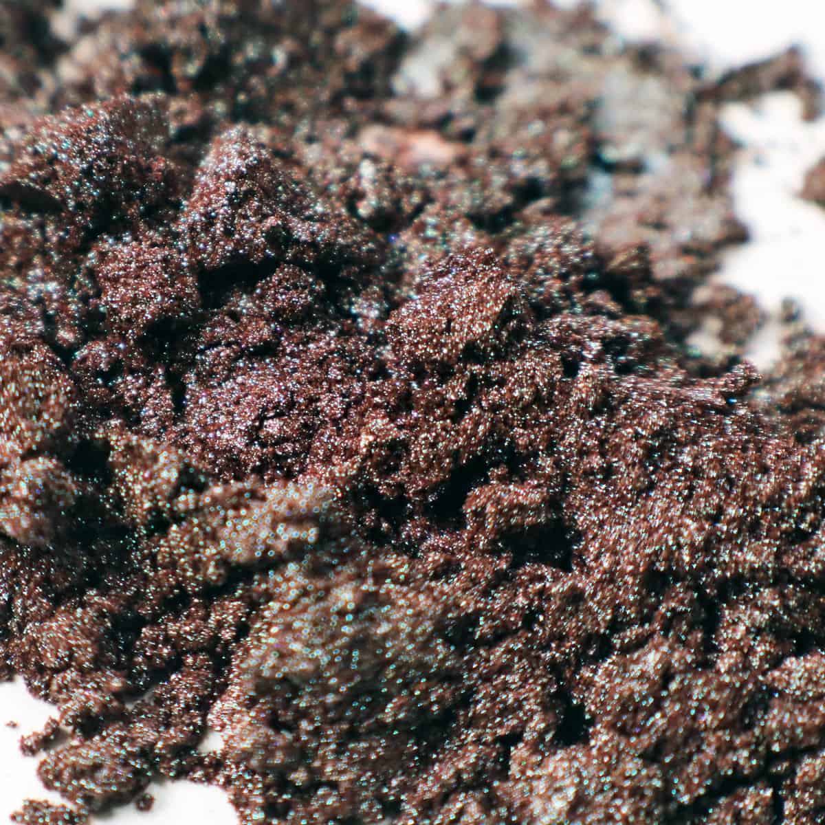 Beaming Brown is a very varied brown glitter with many green metallic shimmering particles. When compacted the green metallic particles begin to outweigh the brown hues with a neon green metallic glow. Thick non-compacted applications allow for plenty of dark to light brown hues with a strong green shimmering particle presence. Thin applications allows the brown hues to be visible with a bright metallic effect with the green being less noticeable.