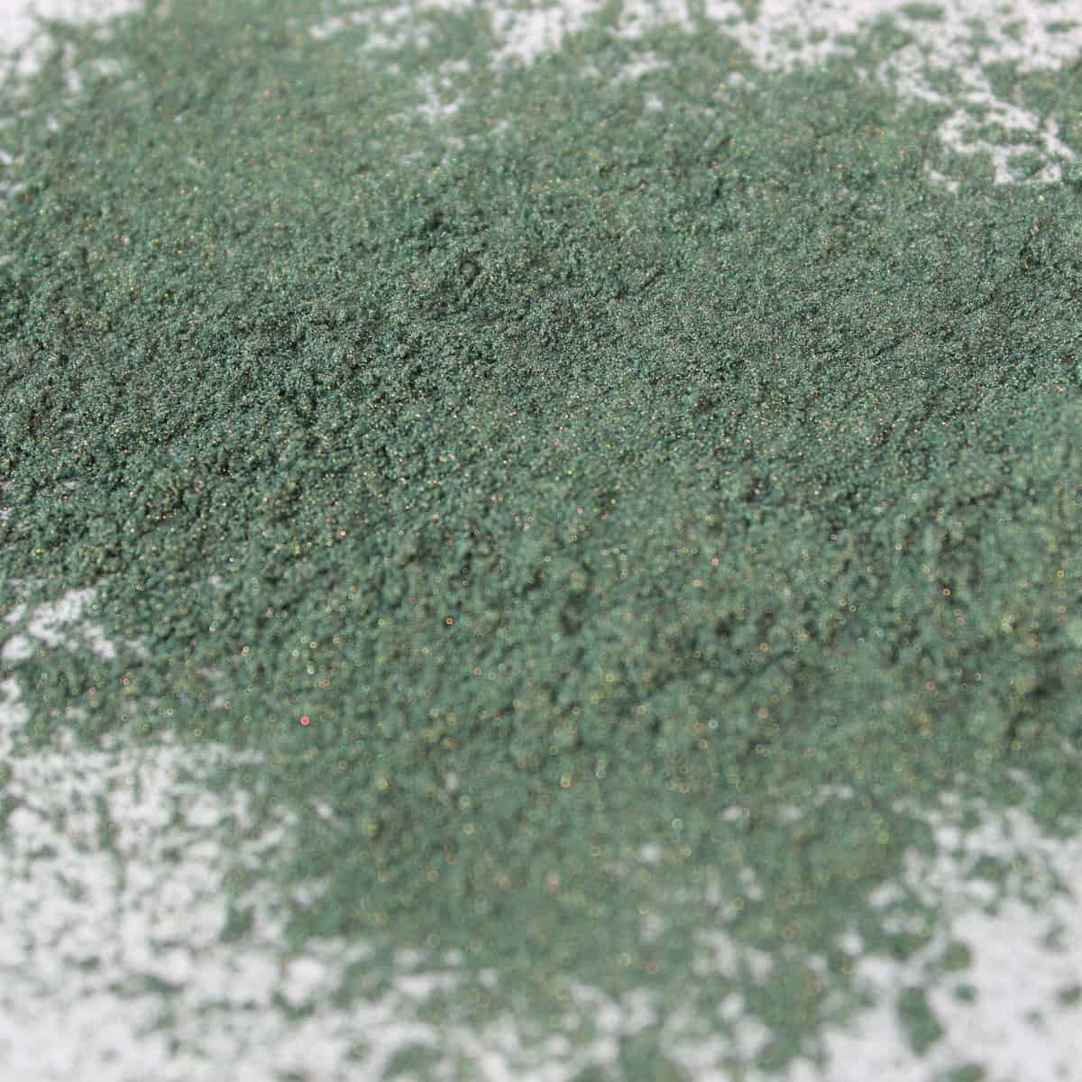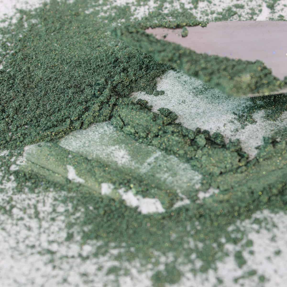 Laurel is a forest green mica. This mica isn’t overpowering, and provides a nature-esque green with a soft metallic shimmer. Thicker applications result in a darker green hue and compacted applications allow for a more metallic effect. The green body has a subtle gold shimmer.