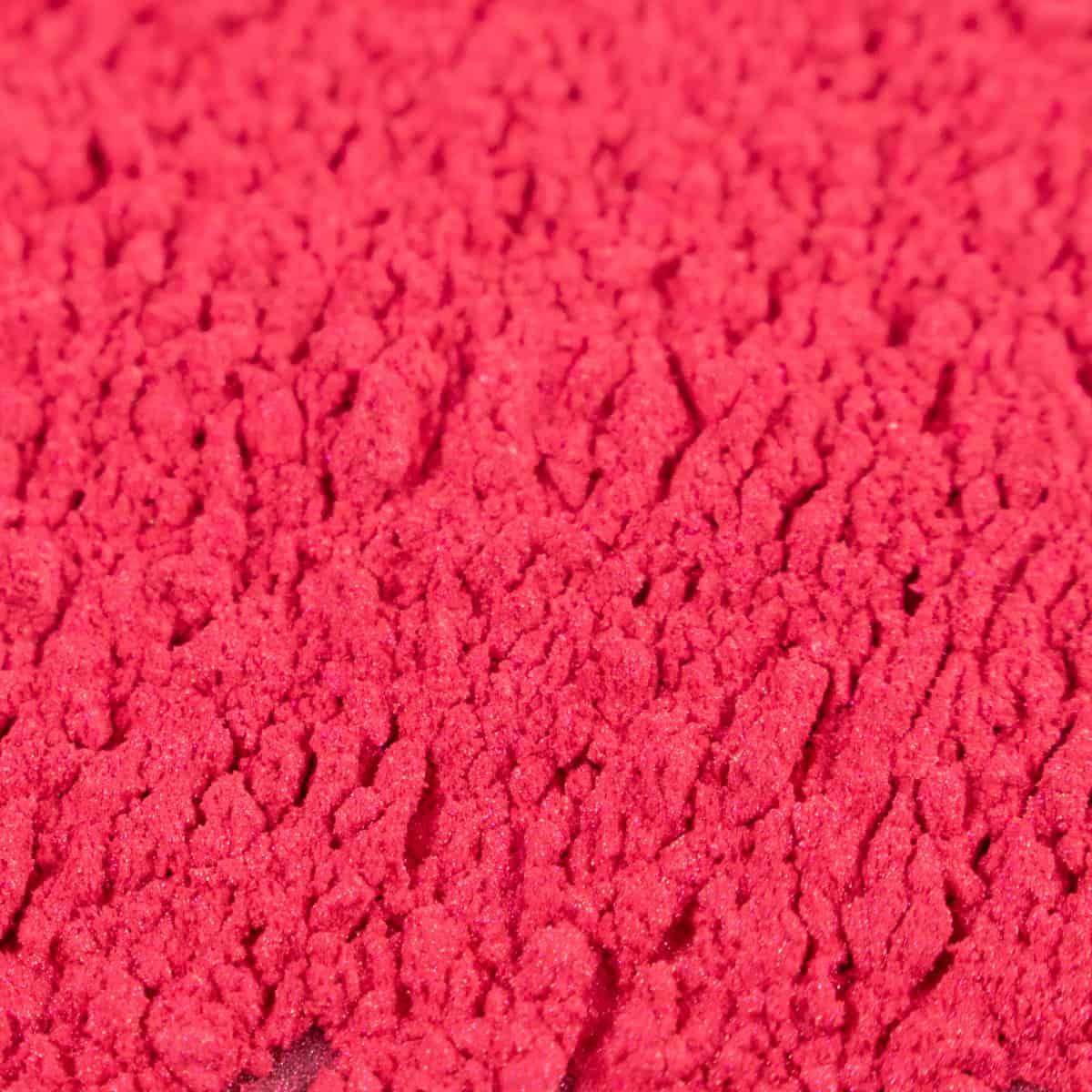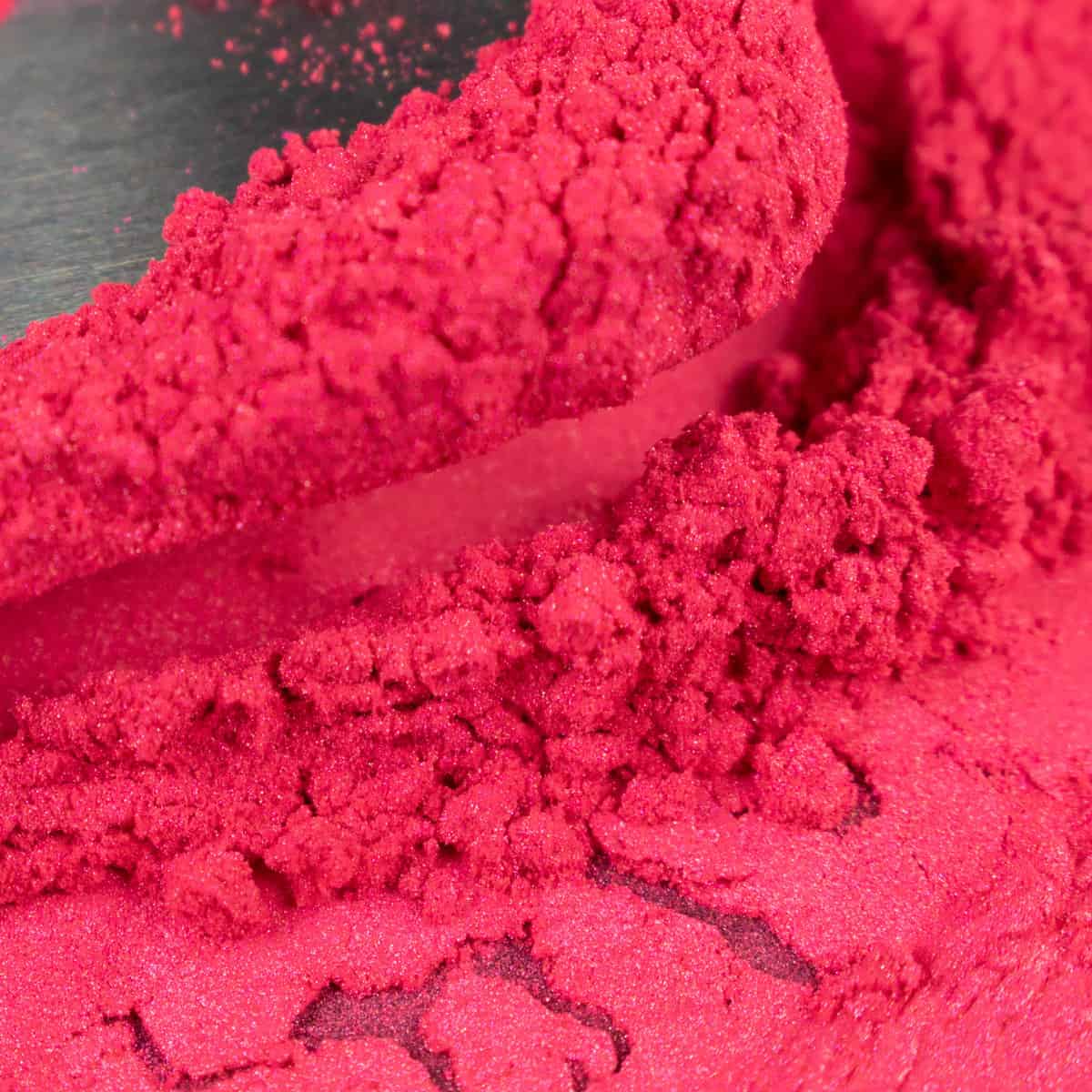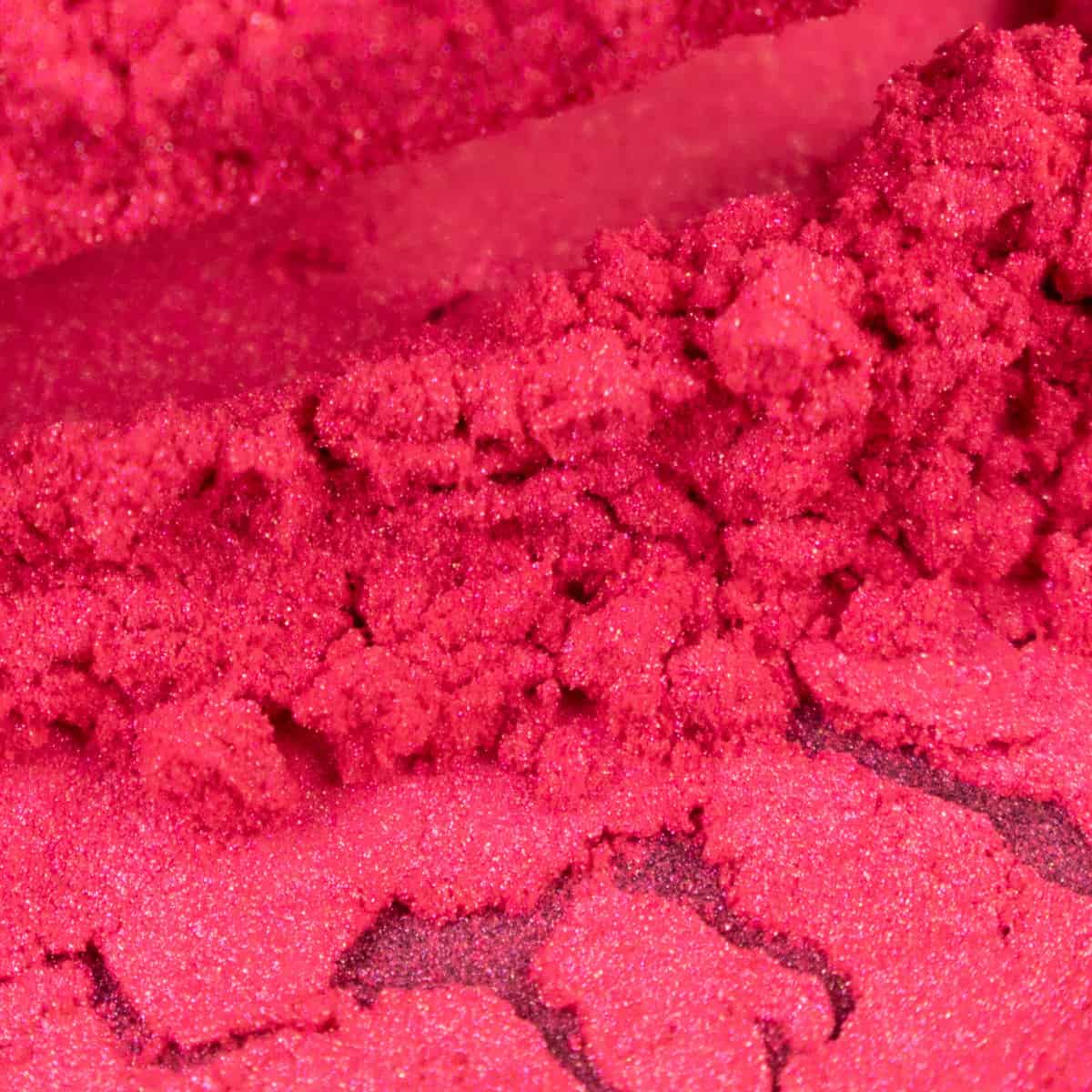 Neon Punch is a bright, almost glowing, mica. It displays a reddish-pink hue with no loss in color. It will make any project pop. Its shimmer is more subtle as compared to this mica’s color. Compacting this mica subdues the hue slightly allowing the metallic effect to be a little more apparent. The hue is strong over both dark and light backgrounds.