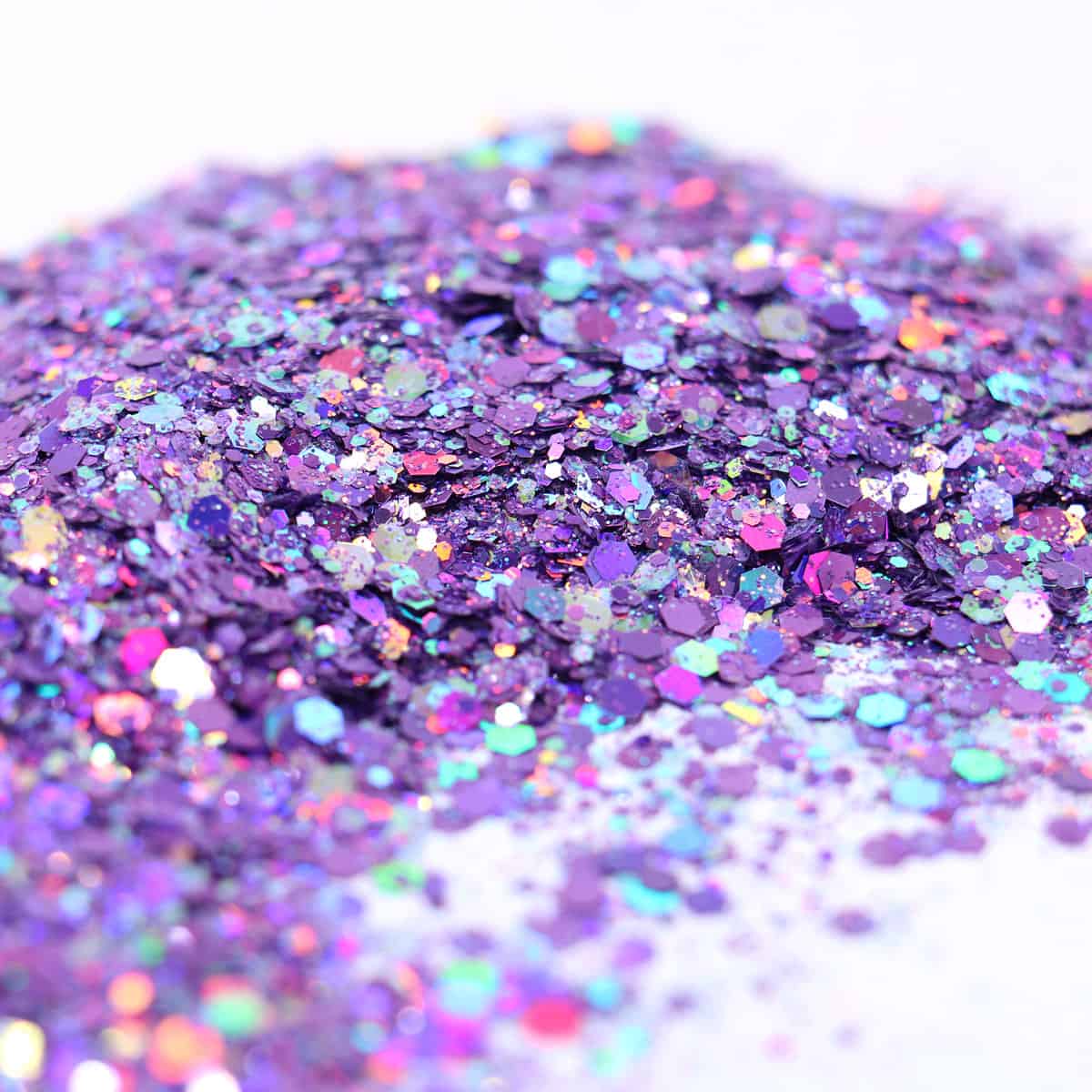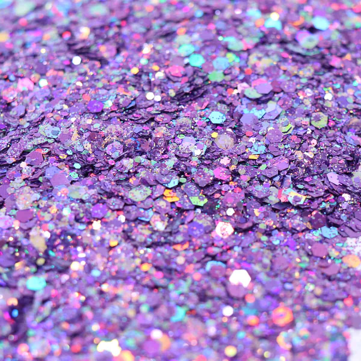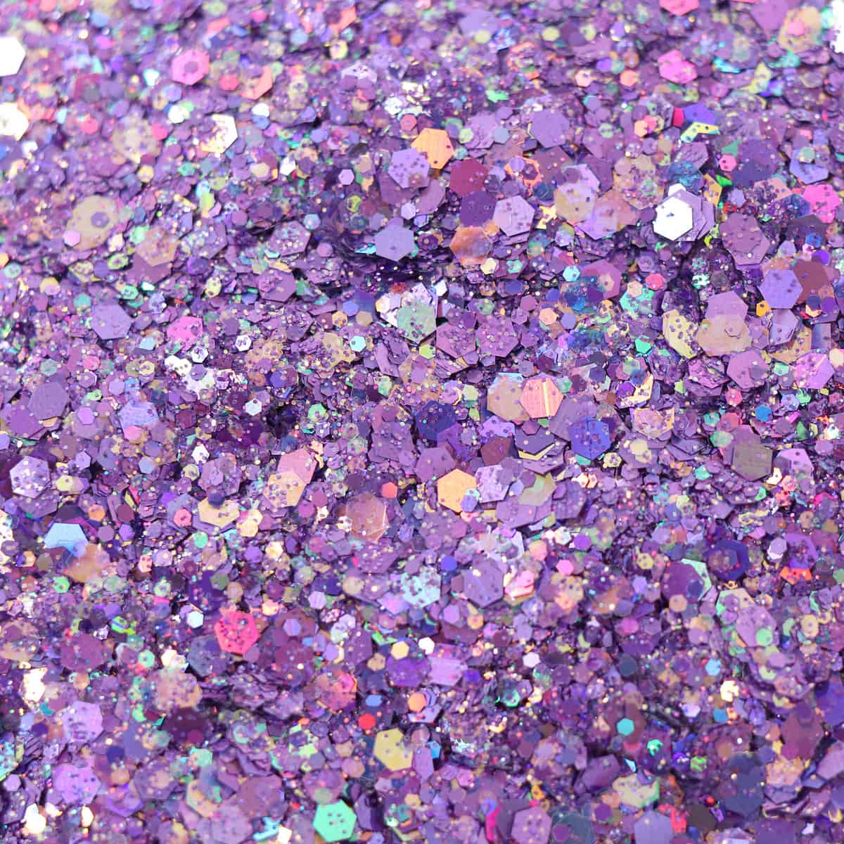 Her highness is a varied glitter in size, color, and shape. It has Medium hexagonal-shaped pieces of glitter to small hexagonal shapes, and very fine particles. This glitter is varied in color with medium purple (main color) and hues that are easily seen are pinks, yellows, greens, blues, and purple.