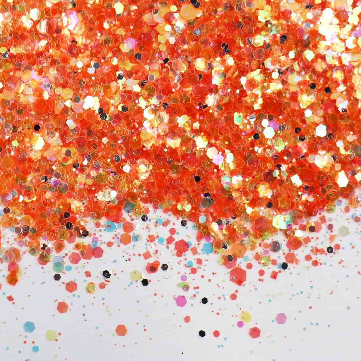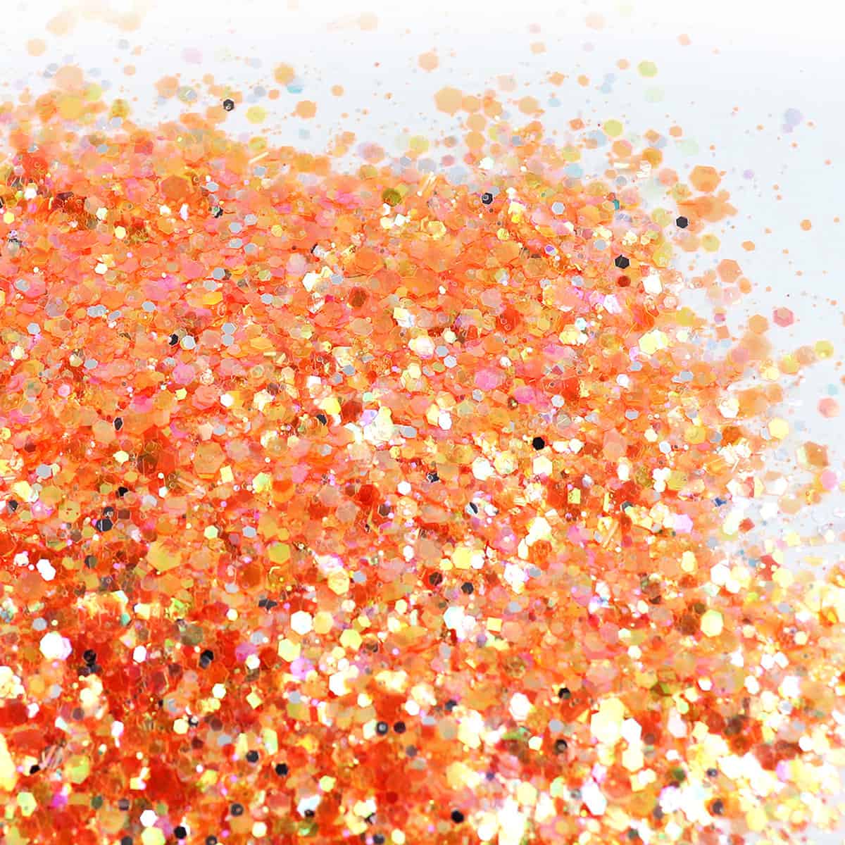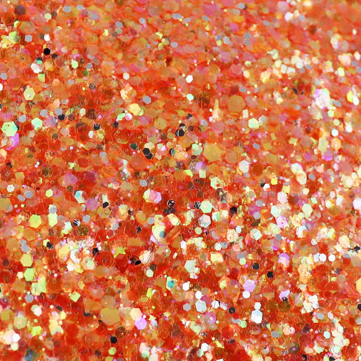 Summer Lovin’ is a vibrant orange glitter. It varies in size from large hexagonal flakes, medium-sized hexagonal shaped flakes, to fine flakes. The main body of glitter is orange, but the translucent flakes reflect a fluorescent array of hues. Expect to see soft pinks, greens, and yellow. Along with the orange glitter body, there can be seen sparsely medium-sized silver flakes. This glitter offers a large variety of color and shape while exuberating the fun of summer!